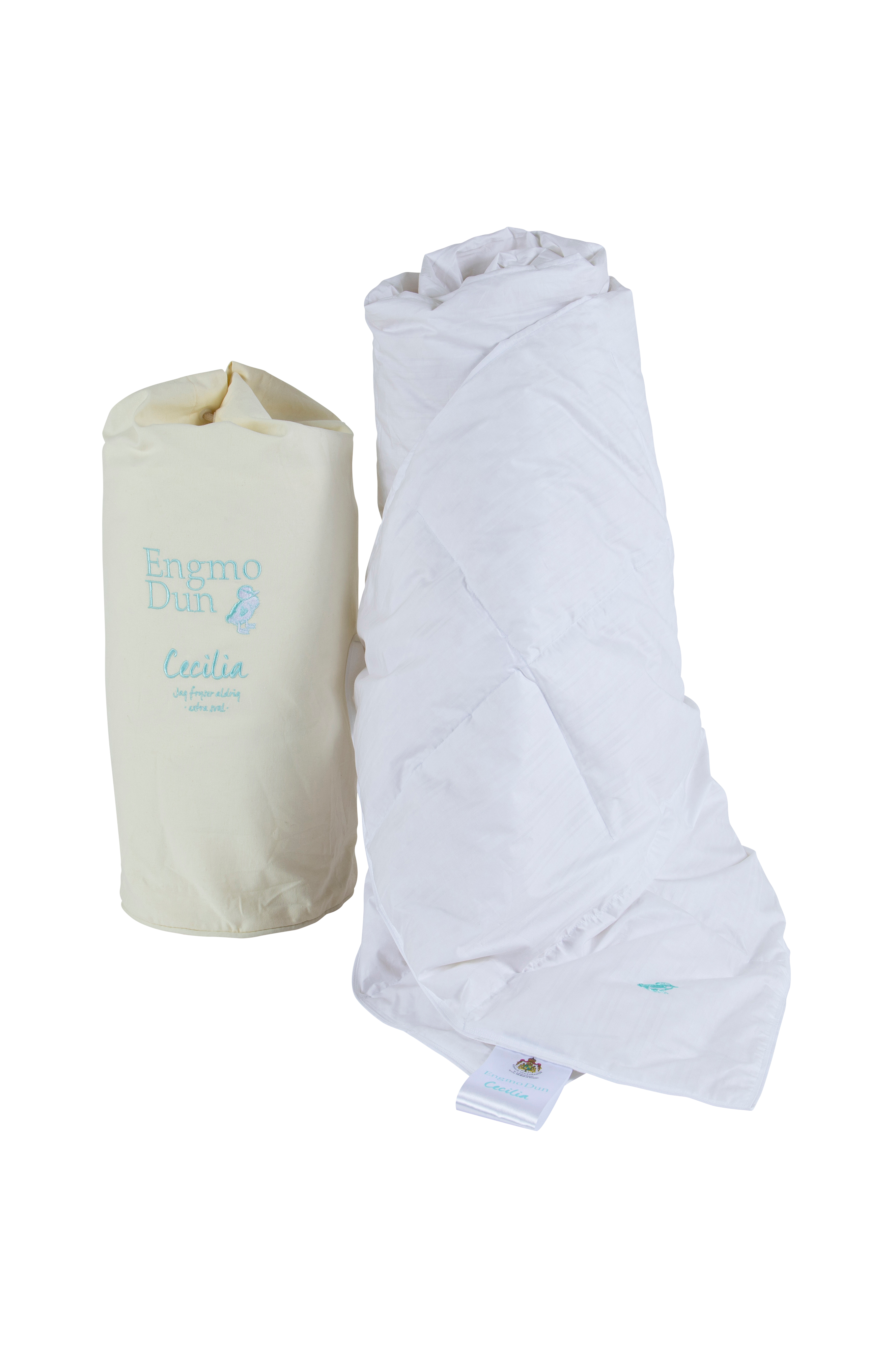 Cecilia är som en fjäderlätt bris ute till havs. Hon svalkar behagligt en sommarnatt, men kan också värma en kylig höstkväll. Det mjuka täcket anpassar sig efter din kroppstemperatur och är fyllt med finaste myskanddun. Vår svalaste variant är fyllt med finaste myskanddun och passar dig som aldrig fryser. Täcket är sytt i rutor med mellanväggar som fördelar dunet i ett mjukt och tätt tyg i fin bomullscambric/twill. Ovansidan är vitrandig och undersidan vit med passpoal och broderi.