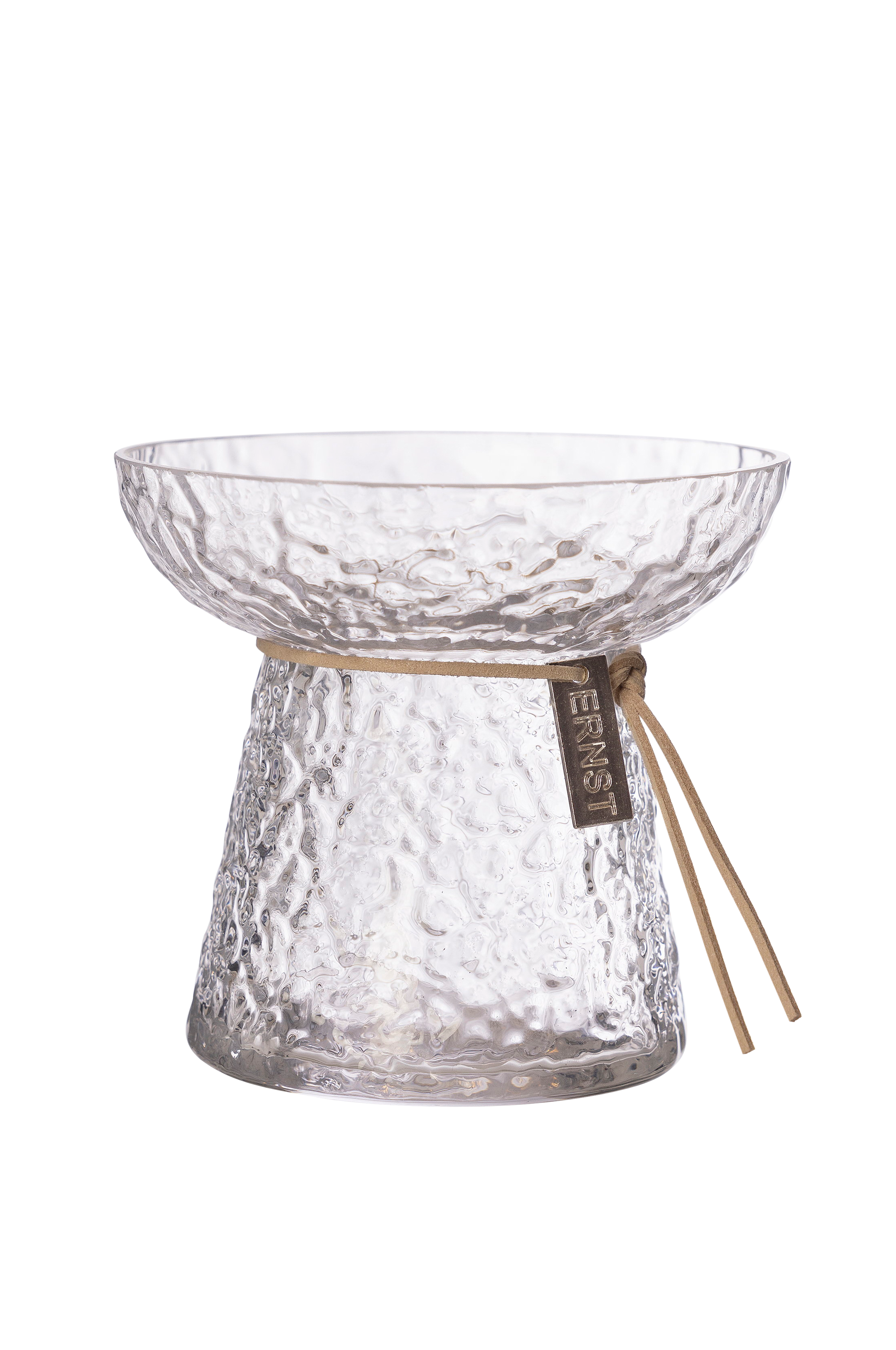 Fin lökvas i mönstrat glas med det klassiska läderbandet som fin detalj, ingår i samma serie som ERNST runda mönstrade glasvaser. Finns i flera storlekar.