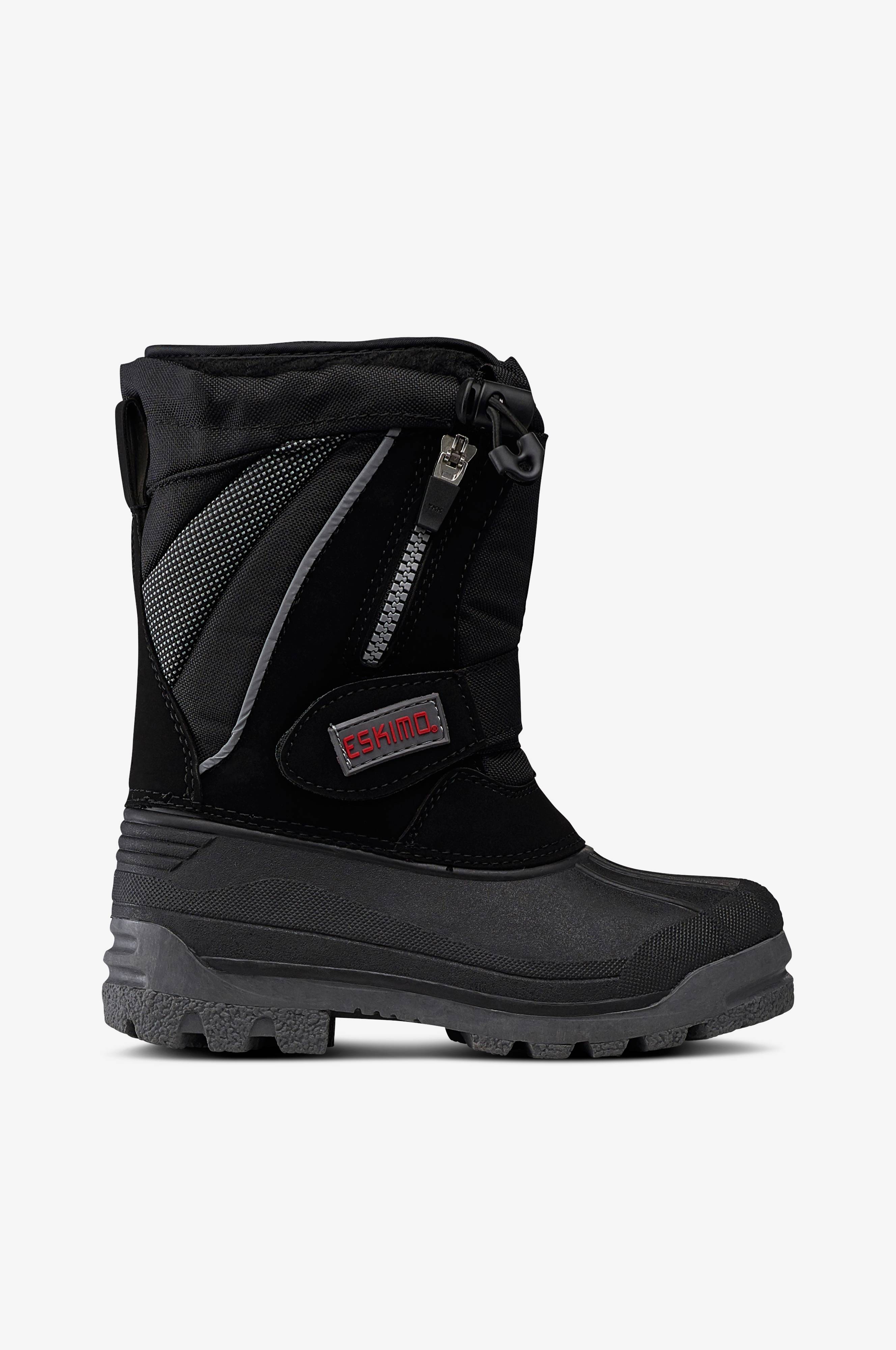 Vinterboots Scooter Child från Eskimo är rejäla vinterboots med vattentät gummifot och skaft i vatten- och smutsavvisande polyamid. Tålig även när det är blött och slaskigt ute. Reglerbar kardborrerem över vristen. Snedställd dragkedja på skaftet med snölås bakom. Elastisk dragsko med stopper upptill på skaftet. Mycket praktisk modell där du kan ta ut innesockan och torka den om du blivit svettig och varm. Den är även tvättbar i maskin. Den kraftiga sockan i polyester klarar ner till -30 grader. Dessutom följer en extra socka med. Mellansulan har värmereflekterande foliesula som fungerar som köldbarriär. Yttersulan är helgjuten i sviktande, grovmönstrad, greppsäkert gummi.