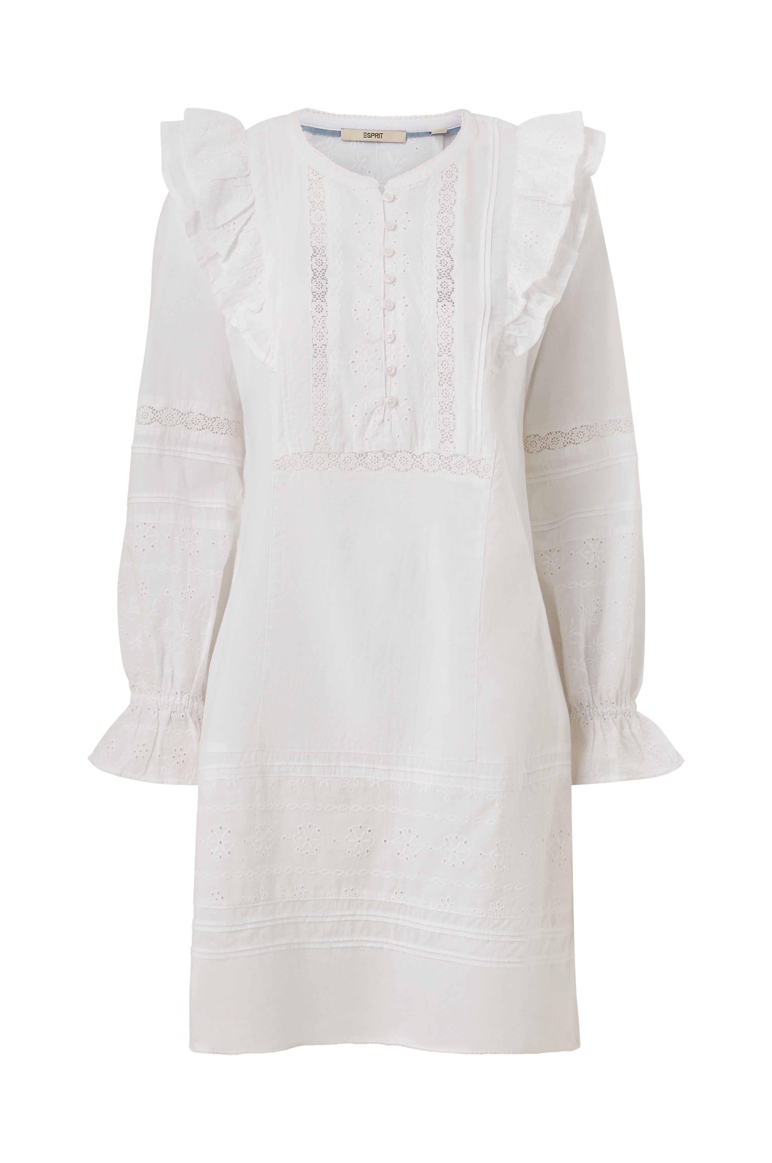 Kort klänning i bomull med broderat hålmönster.• Knappar upptill fram• Långa ärmar med volang i ärmsluten• Volanger på axlarna• Tunn underklänning i vävd kvalitet• Längd ca 92 cm i stl 36