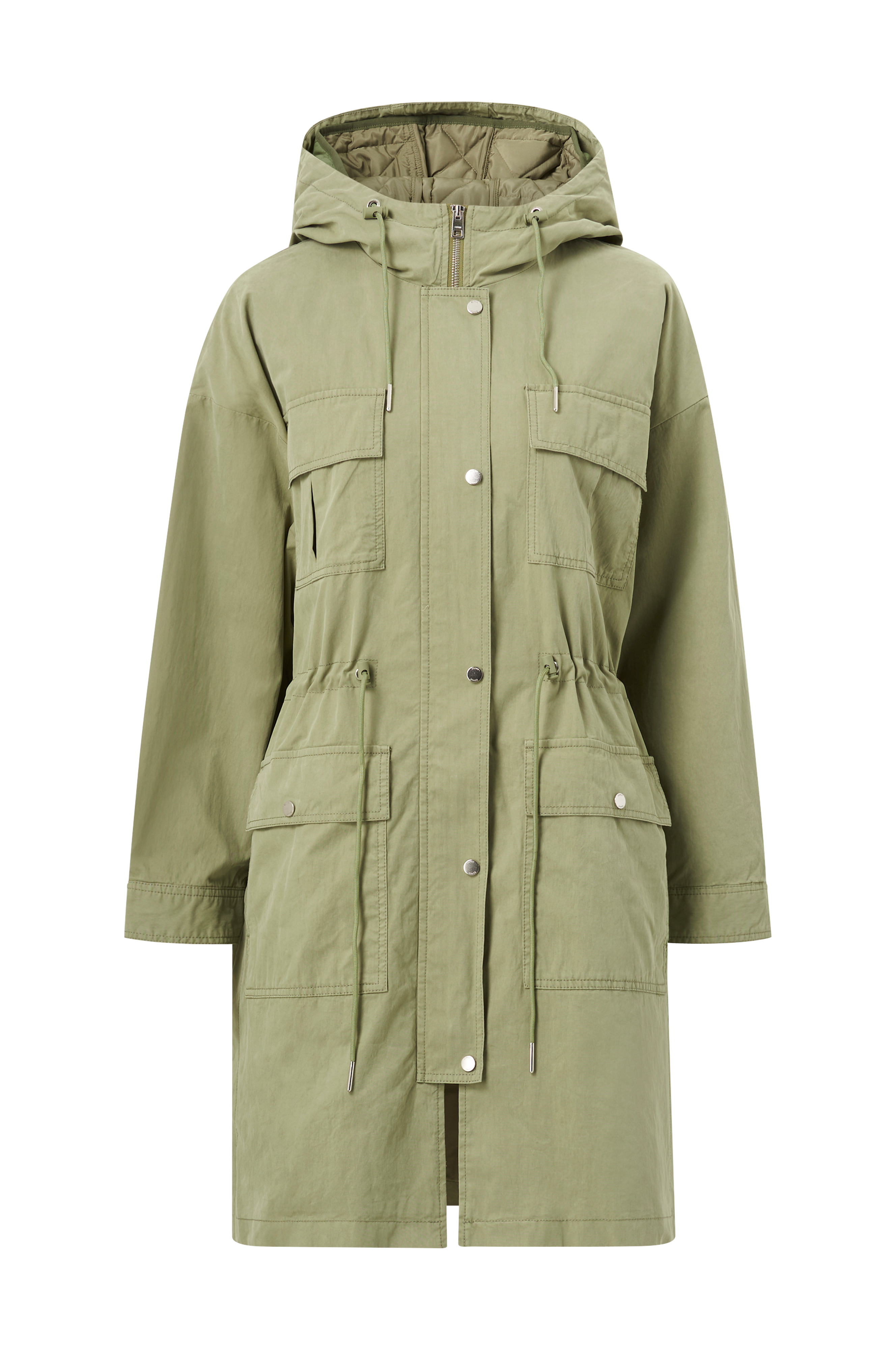 • Parkas i bomullsmix • Avtagbar quiltad innerväst som kan bäras separat • Fast huva med dragsko • Hellång dragkedja och knappslå med tryckknappar • Fyra fickor med lock och tryckknappar • Två insticksfickor • Dragsko i midjan • Tryckknapp i ärmsluten • Tryckknappar nedtill i sidorna • Längd ca 96 cm i stl S