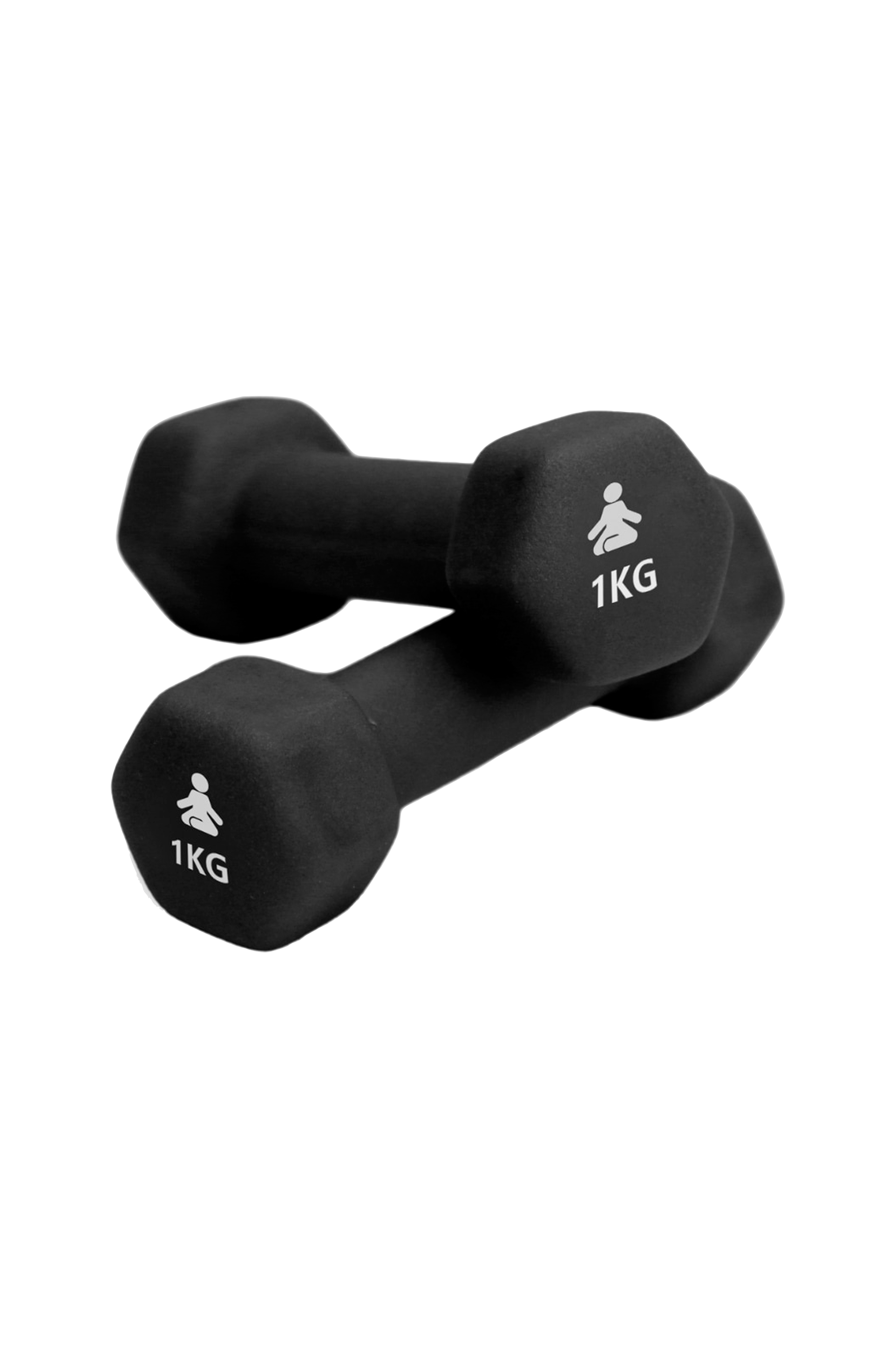 Två hantlar på 1 kg med antirullande hexagonal form, belagda med neopren för maximal komfort och greppstabilitet