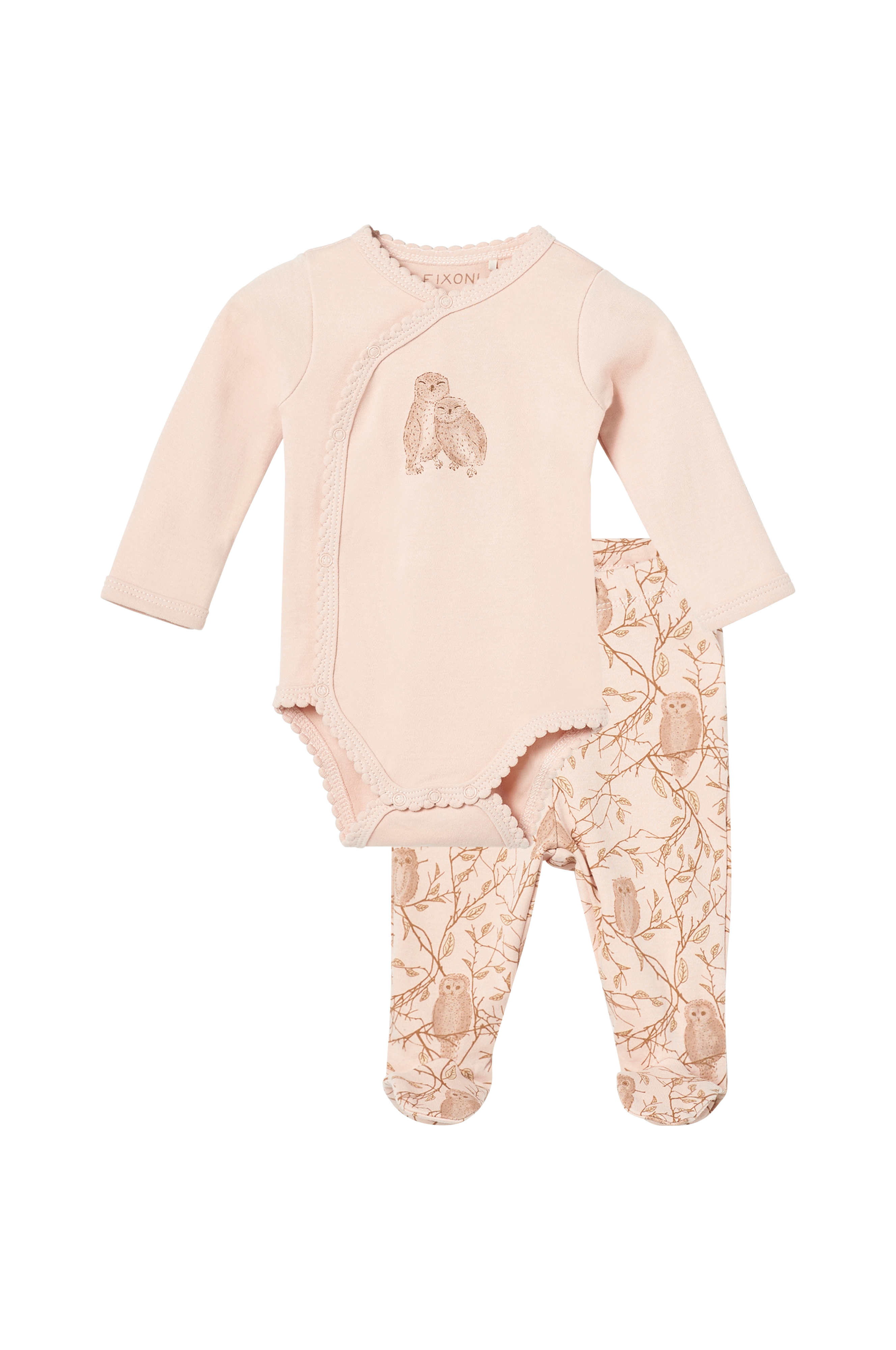• Tvådelat set i mjuk bomullstrikå • Långärmad body med omlottdesign • Tryckknappar i grenen och fram • Byxor med elastisk midja • Hel fot • Produkten innehåller ekologisk bomull som är odlad utan kemiska bekämpningsmedel, konstgödsel och genmodifierade grödor (GMO). Det innebär en mer hälsosam arbetsmiljö för bönder och bättre jordmån. • Produkten är certifierad enligt STANDARD 100 by OEKO-TEX®. Certifieringen garanterar att produkten är testad och fri från ämnen som kan vara skadliga för hälsan och miljön. Licensnummer & testinstitut: 2276-365 DTI