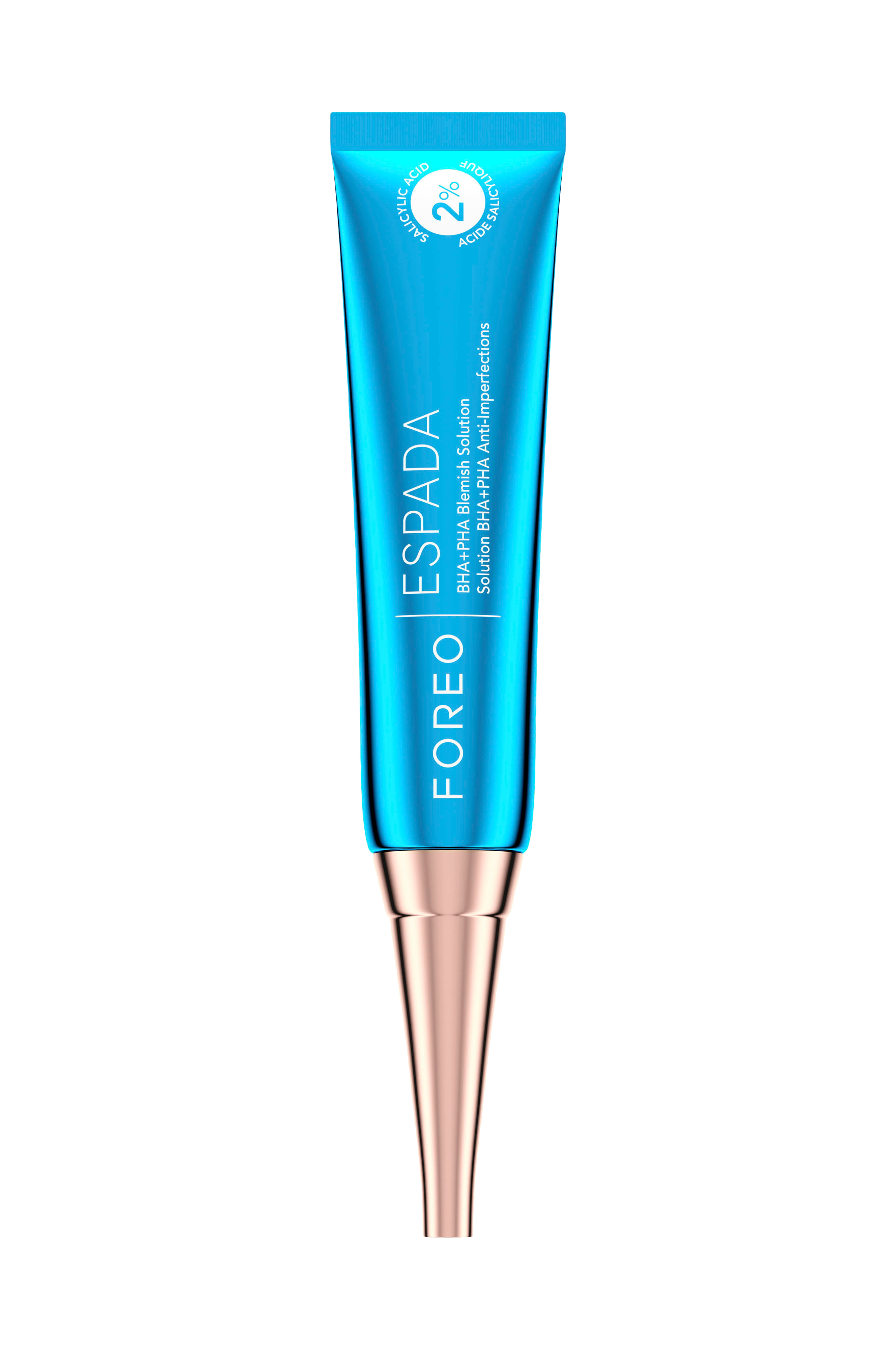 ESPADA™ Blemish Solution är en potent punktbehandling för envis akne, blemmor och pormaskar. Denna koncentrerade men ändå lätta gel är utformad för riktad behandling av akne och innehåller 2% salicylsyra, trollhassel, niacinamid, tea tree-olja, panthenol och laktobionsyra. Den rensar effektivt porerna, exfolierar försiktigt, minskar inflammation, minskar akne, bleker ojämnheter och minimerar framtida utbrott. Gelen ger en klar och strålande hud utan att torka ut den.