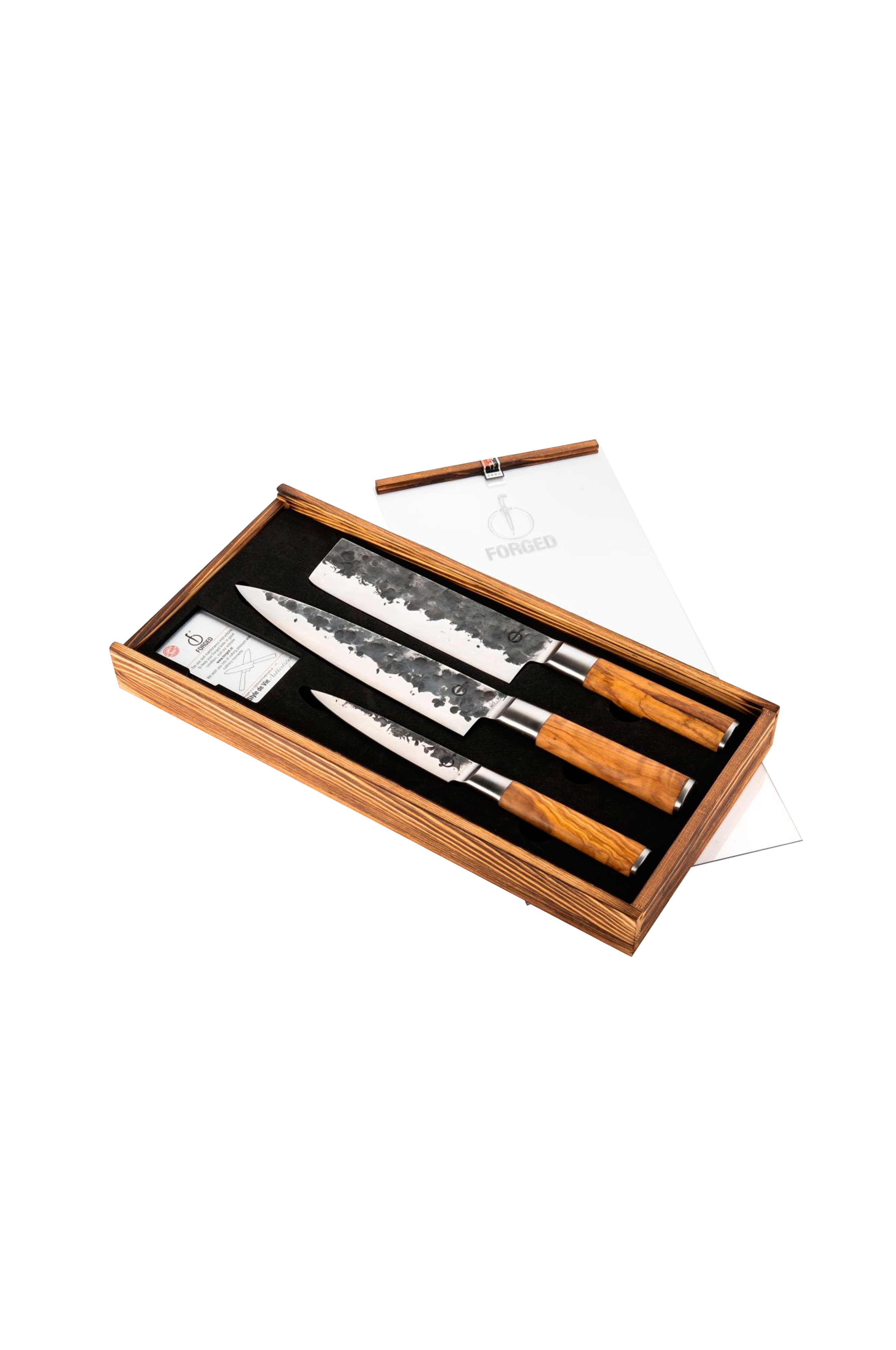 Den smidda olivknivsetet i 3 delar innehåller en kockkniv, en grönsakskniv och en hobbykniv i en lyxig låda. De smidda olivknivarna är tillverkade av japanskt 440c-stål med en hårdhet på 58 rockwell. Alla smidda knivar är smidda för hand, har en bladtjocklek på 2 mm och en 18-gradig skärvinkel. Vi lämnar 10 års garanti.