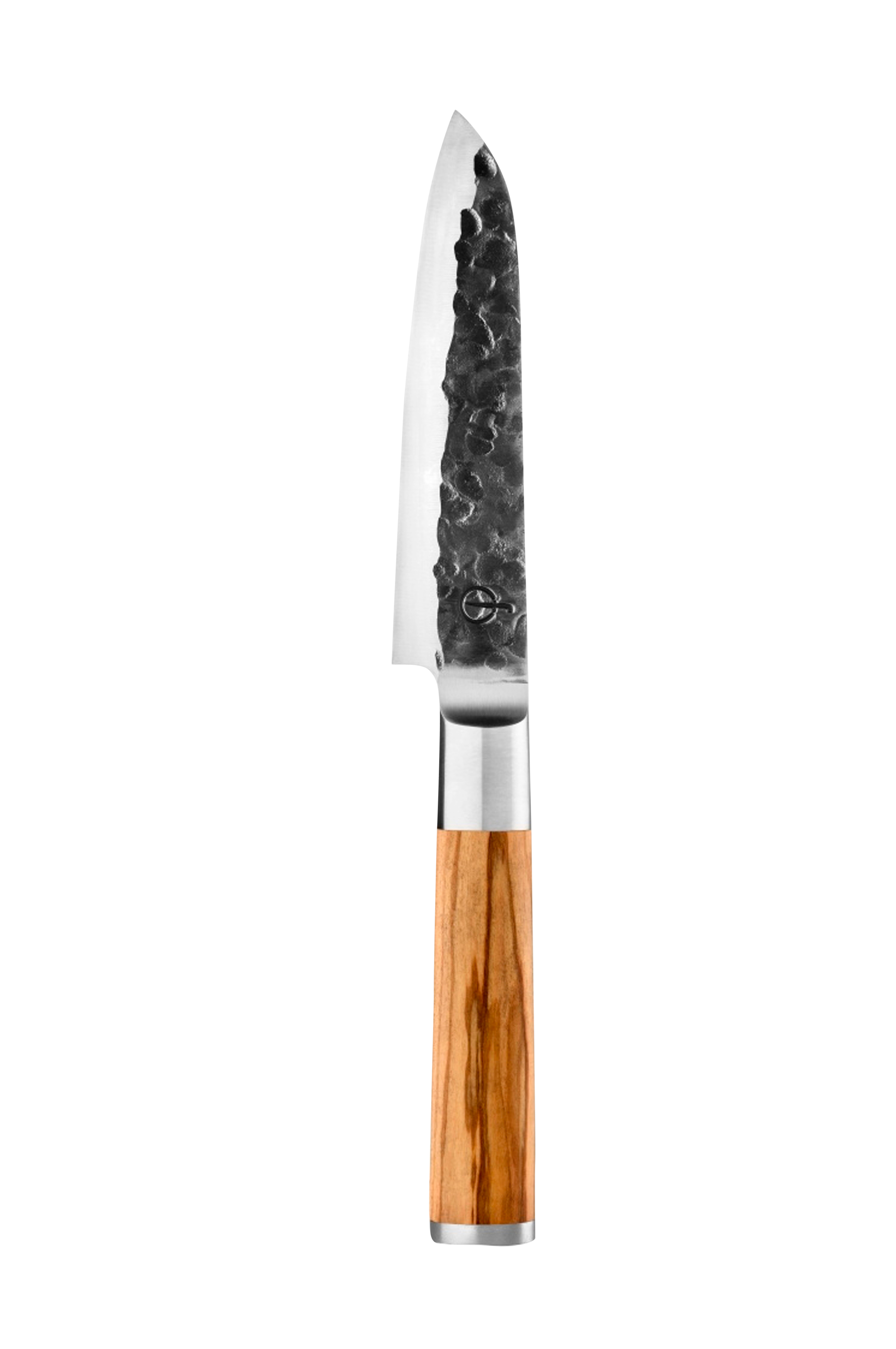 Den smidda kniven olive santoku 14 cm är den japanska versionen av kockkniven. Ordet "santoku" betyder "tre dygder", en hänvisning till de tre skärfunktioner som kniven kan utföra: skiva, tärna och hacka. Denna mångfald gör den till en allroundkniv i köket. De smidda olivknivarna är tillverkade av japanskt 440c-stål med en hårdhet på 58 rockwell. Alla smidda knivar är smidda för hand, har en bladtjocklek på 2 mm och en 18-gradig skärvinkel. Levereras i en lyxig låda.