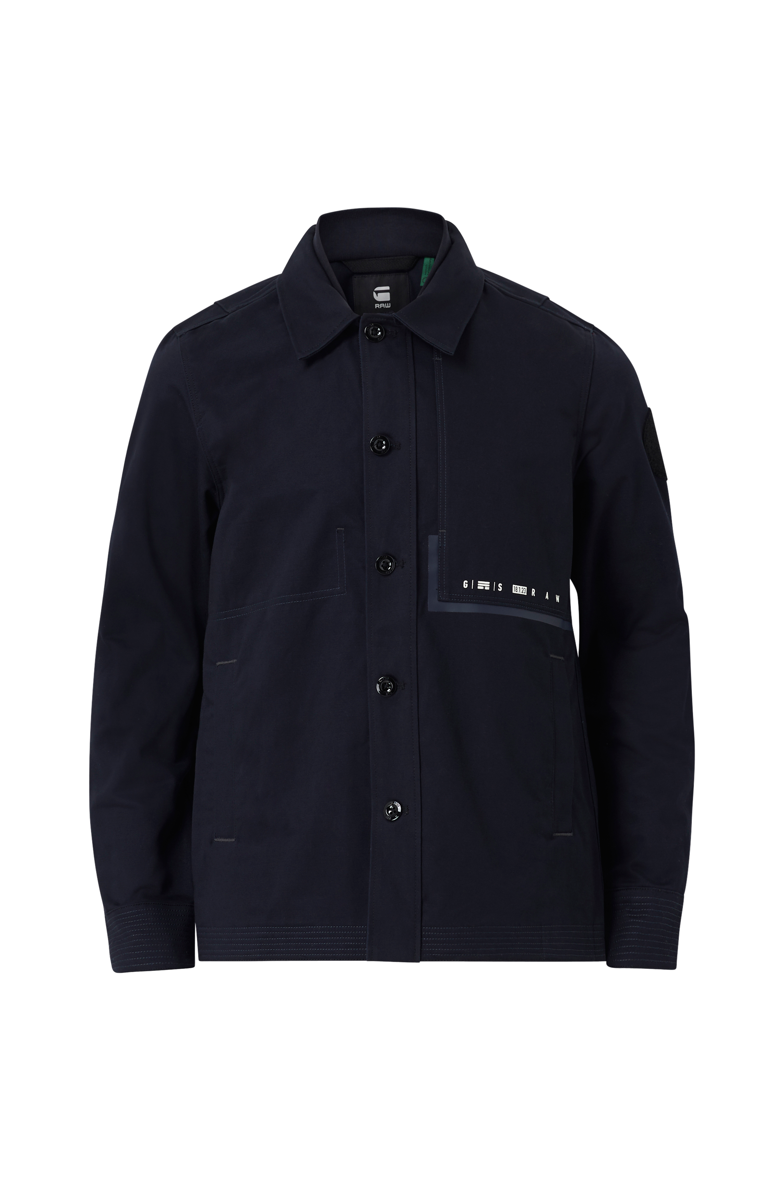 Overshirt Naval från G-star i ekologisk bomull. Ribbad innerkrage och tryckta detaljer fram. Två fickor nedtill, en bröstficka och en innerficka. Reglerbar vidd i ärmslut med två knappar. Patch på vänster ärm och en mindre patch upptill bak. Längd ca 71 cm i stl M.