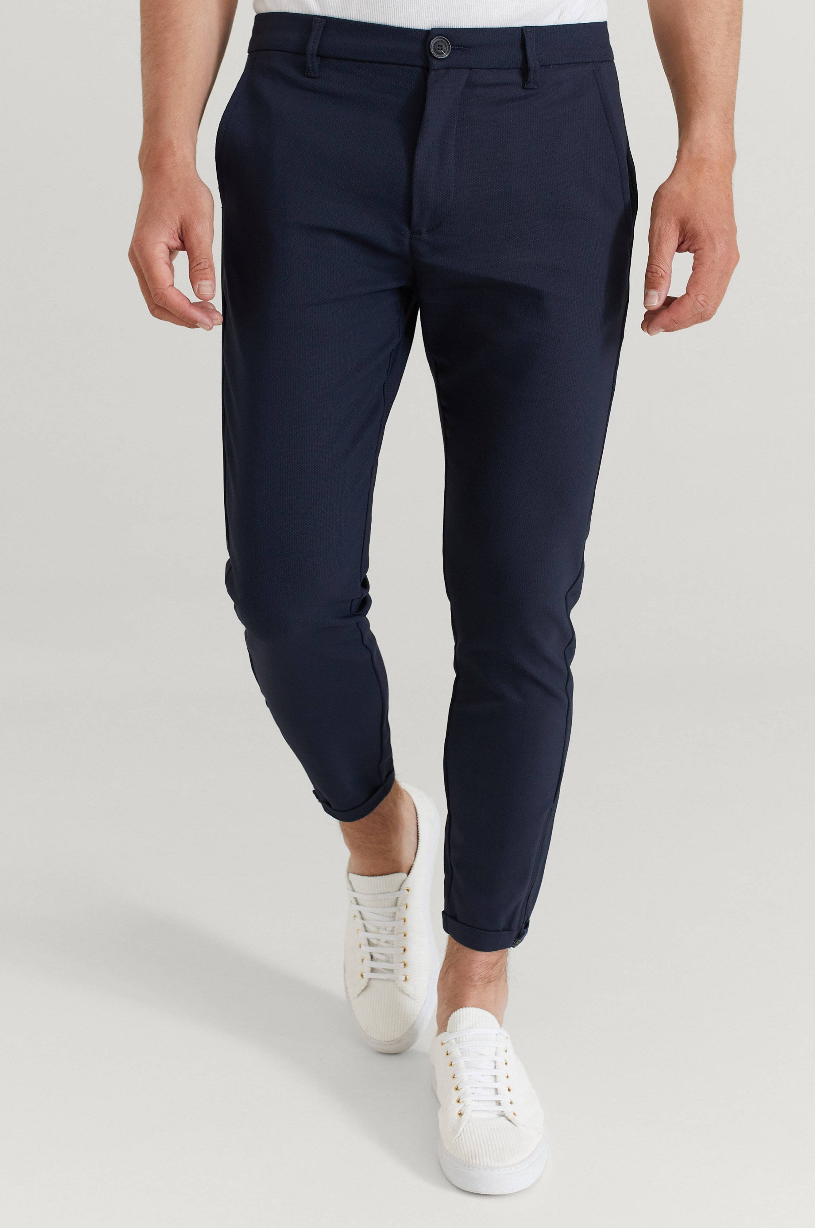 Byxor Pisa Small Dot från Gabba. Chinosmodell i bekväm stretchkvalitet med diskret, småprickigt mönster. Linning med hällor, knapp och gylf med dragkedja. Sydda uppvik i benslut med dragkedja. Två fickor fram och två infällda bakfickor. Beninnerlängd ca 68 cm i stl M.