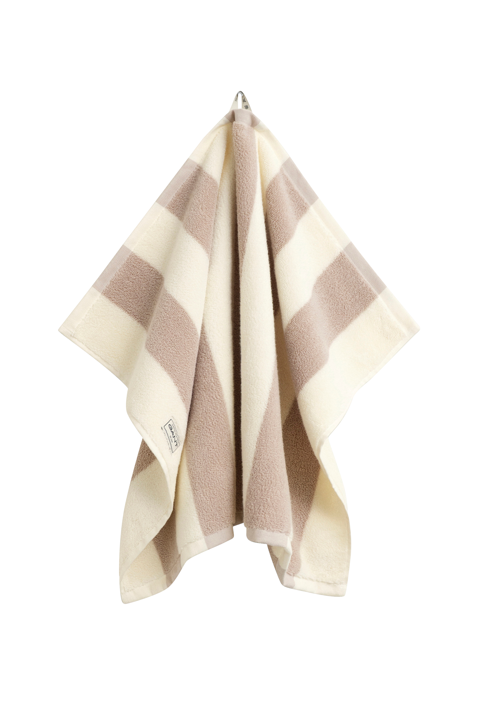 Denna 50 cm x 70 cm stora handduk är mönstrad med vävda ränder och en jacquard Gant-etikett. Den är vävd i frotté med en vikt på 600 g/m2, extra tjock, högabsorberande och supermjuk.