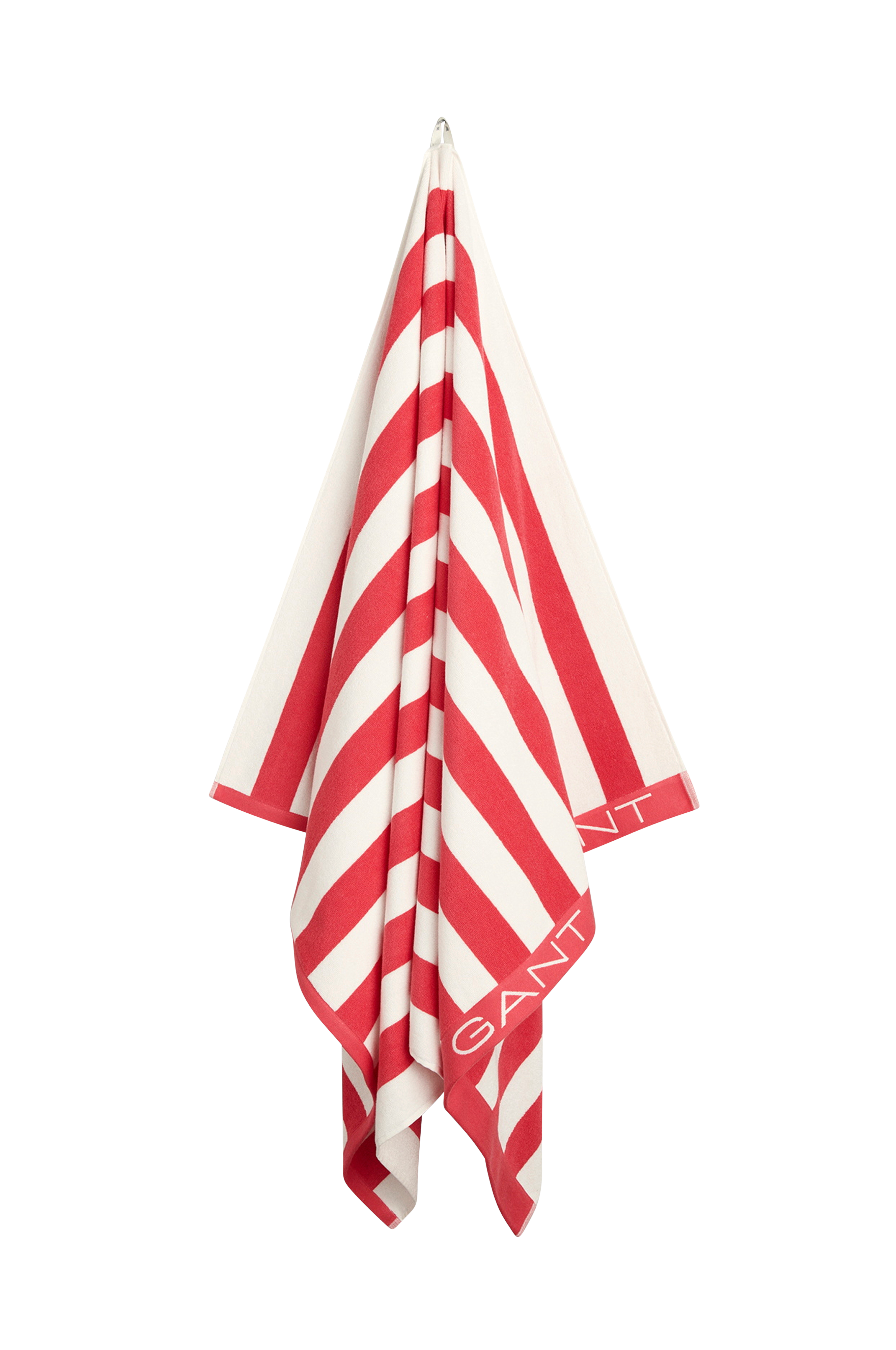 Denna strandhandduk i frotté är designad med blockränder för en nautisk touch och är det perfekta sommartillbehöret för pooldagar, stranddagar och mer. Tillverkad av certifierad ekologisk bomull, den är gjord med en absorberande och tjock vikt på 450 g/m2. Den har en GANT-logotyp i jacquard i nederkant.