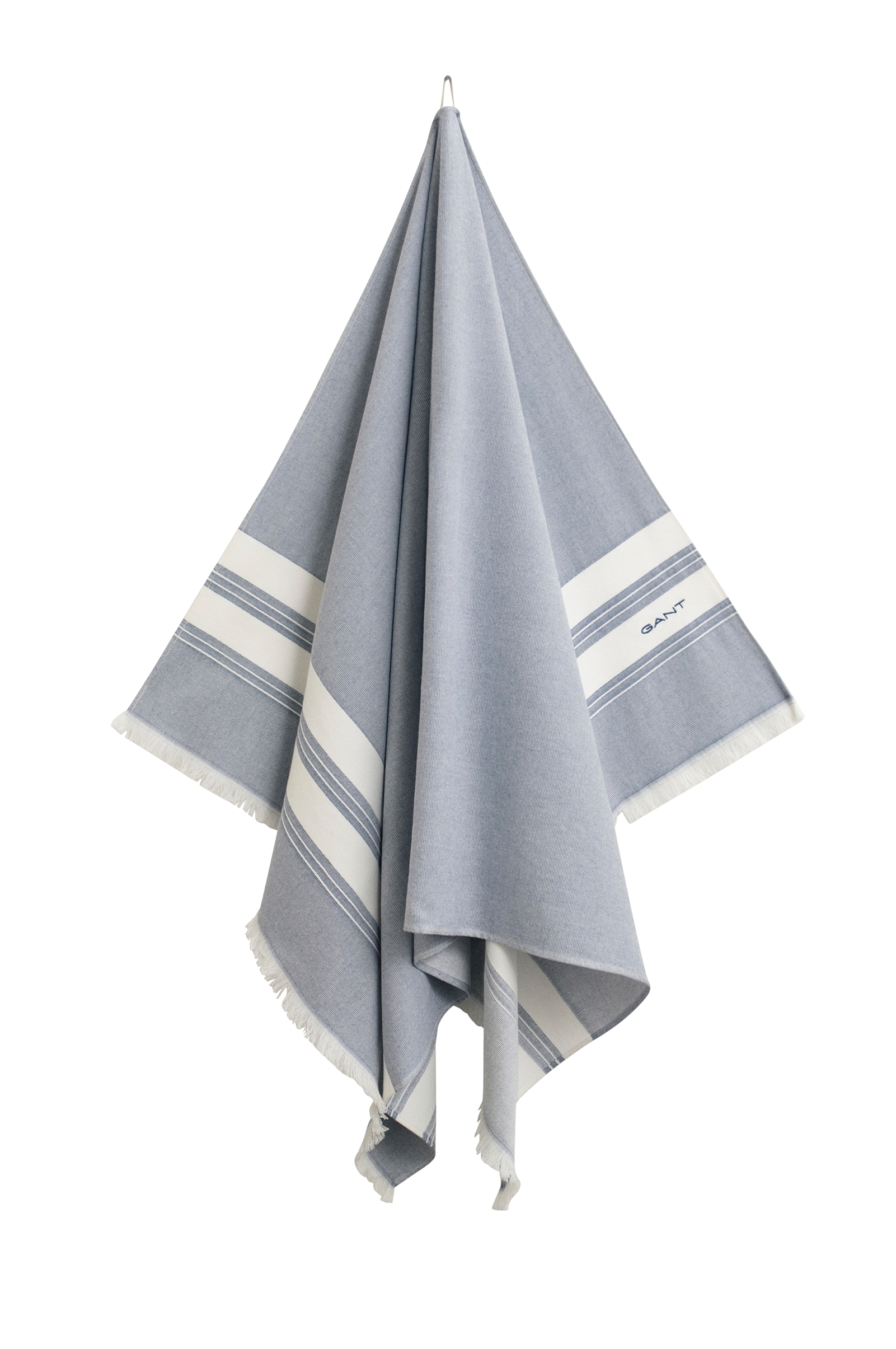 Denna strandhandduk i frotté är designad med stripe detaljer och fransar i varje ände och är den perfekta sommaraccessoaren för pooldagar, stranddagar och mycket mer. Den är tillverkad i en absorberande och tjock 300g/m2-vikt. Den har en broderad Gant-logotyp i nederkanten.