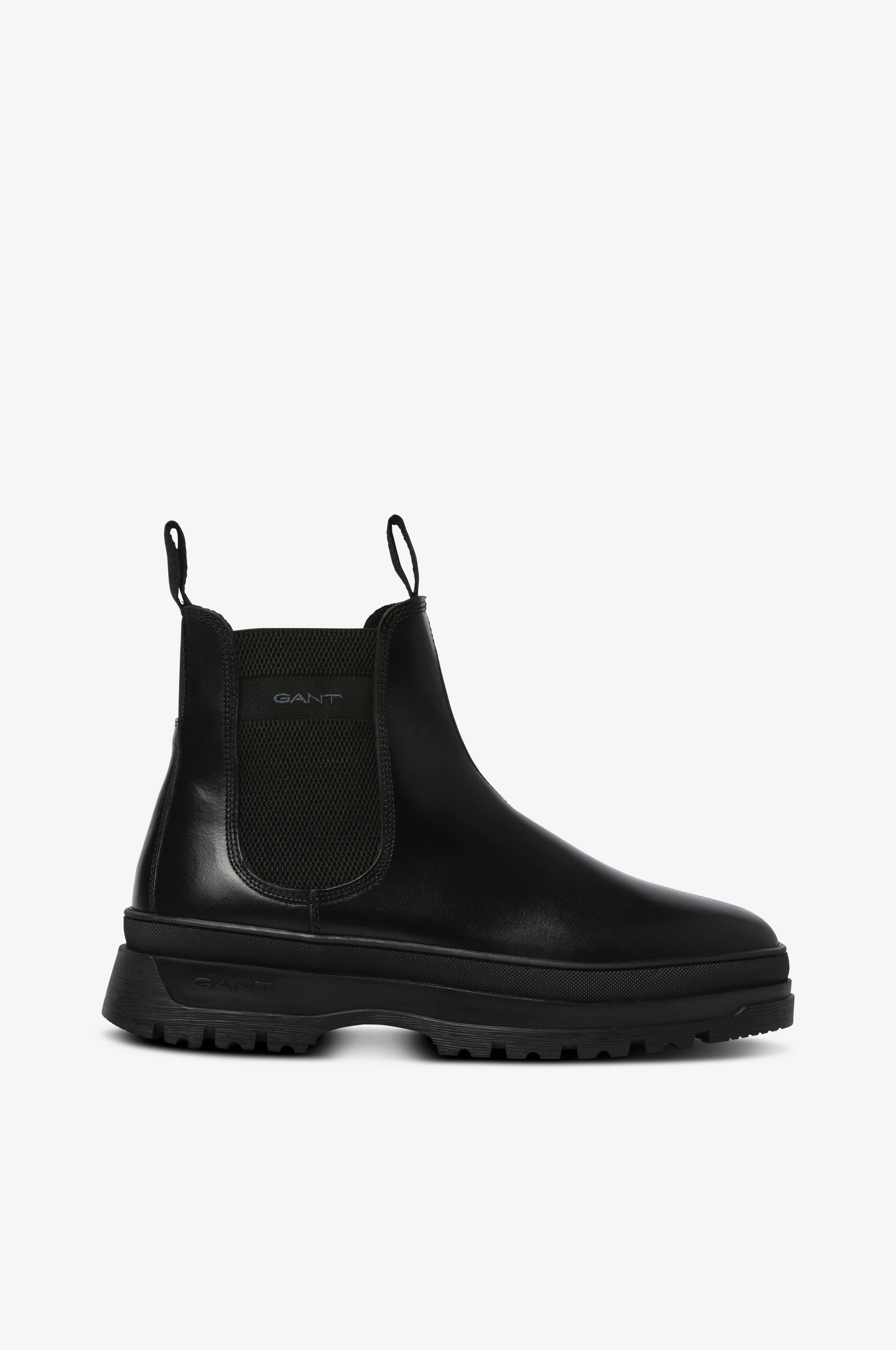 • Ovandel i skinn• Resårpaneler på skaftets båda sidor• Två vävda dragöglor• Foder i ull• Yttersula i gummi• Skafthöjd: 13 cm i stl 42