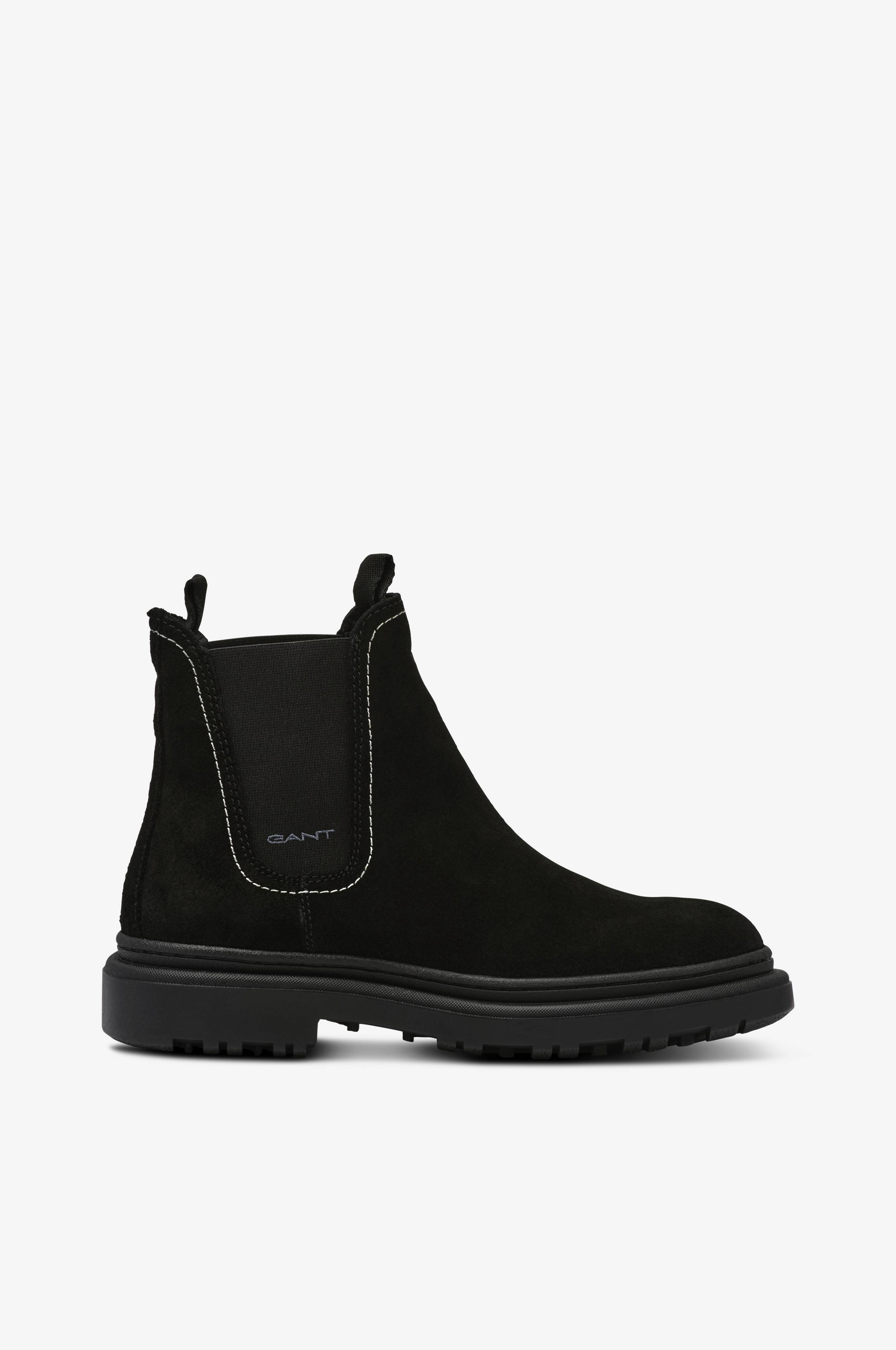 • Chelseaboots i mocka• Resårpaneler på skaftets båda sidor• Två vävda draghällor på skaftet• Textilfoder• Skinnklädd innersula• Yttersula i gummi