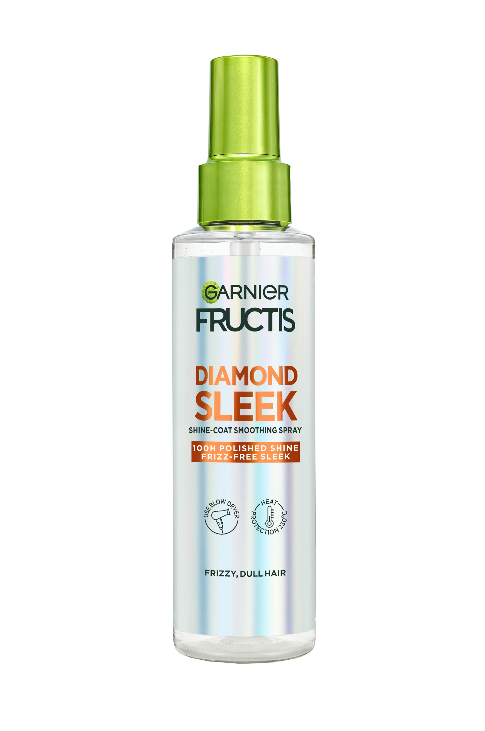 Garnier Fructis Diamond Sleek Shine-Coat Smoothing Spray är en utjämnande spray för frissigt och glanslöst hår. Den är för dig som vill ha ett slätt och blankt hår som är skyddat mot friss. Den lätta formulan fungerar även i hög luftfuktighet och lämnar inte håret fett eller klibbigt. Få upp till 100 timmars glans och 72 timmars frissfritt, slätt hår¹.