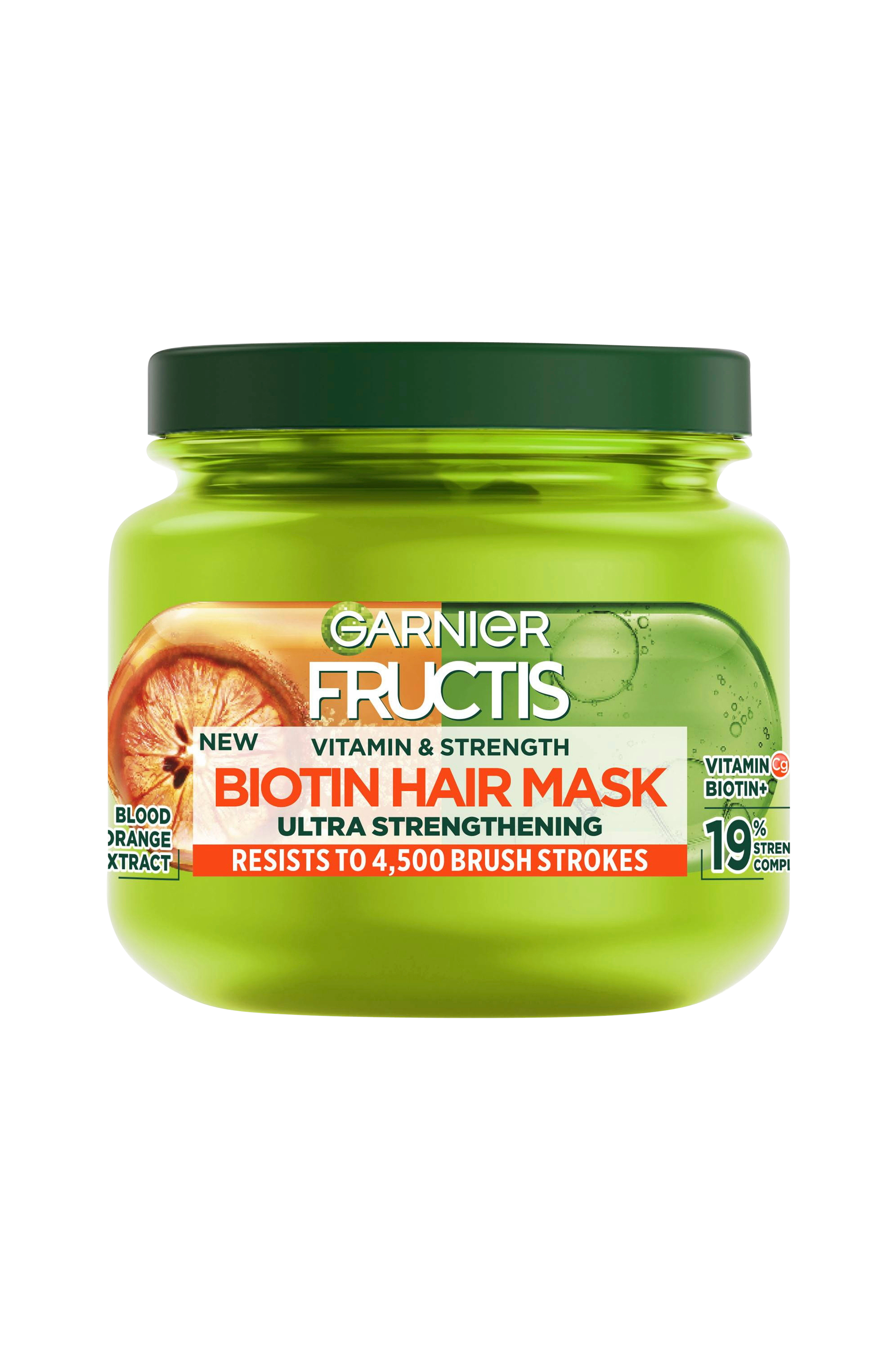 Garnier Fructis Vitamin & Strength strenghtening Biotin Mask gör håret motståndskraftigt mot skador från upp till 4 500* borstningar. Vegansk formula** berikad med biotin, vitamin Cg och extrakt från blodapelsin för att öka hårets massa och reducera mängden hår som brister. Ditt hår känns fylligare och starkare utan att tyngas ned.