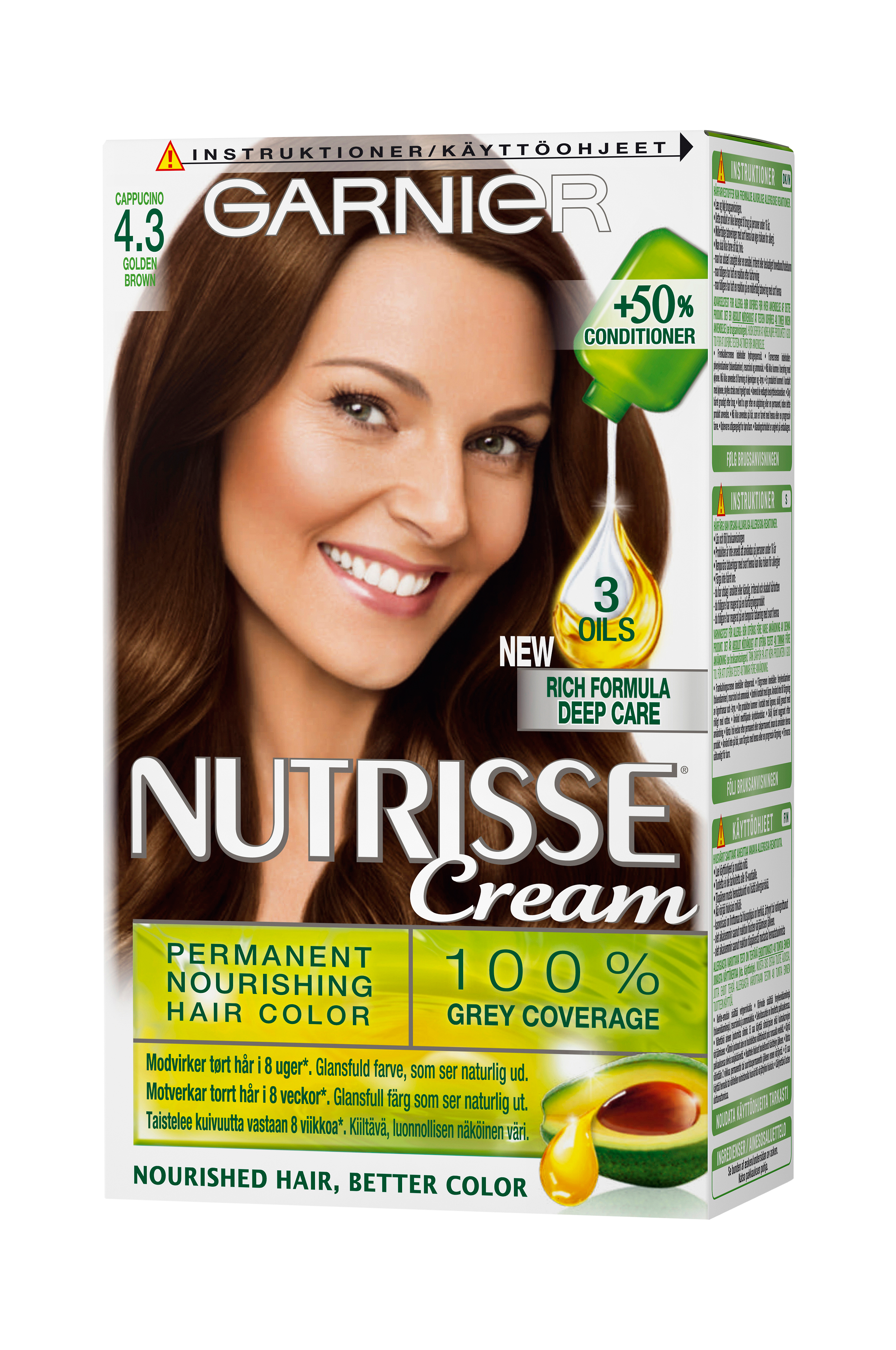 Nutrisse Cream 4.3 Guldbrun är en brun, guldig hårfärg som passar naturligt ljusblont till svart hår. Resultatet beror på din naturliga hårfärg. Täcker går hårstrån 100%.