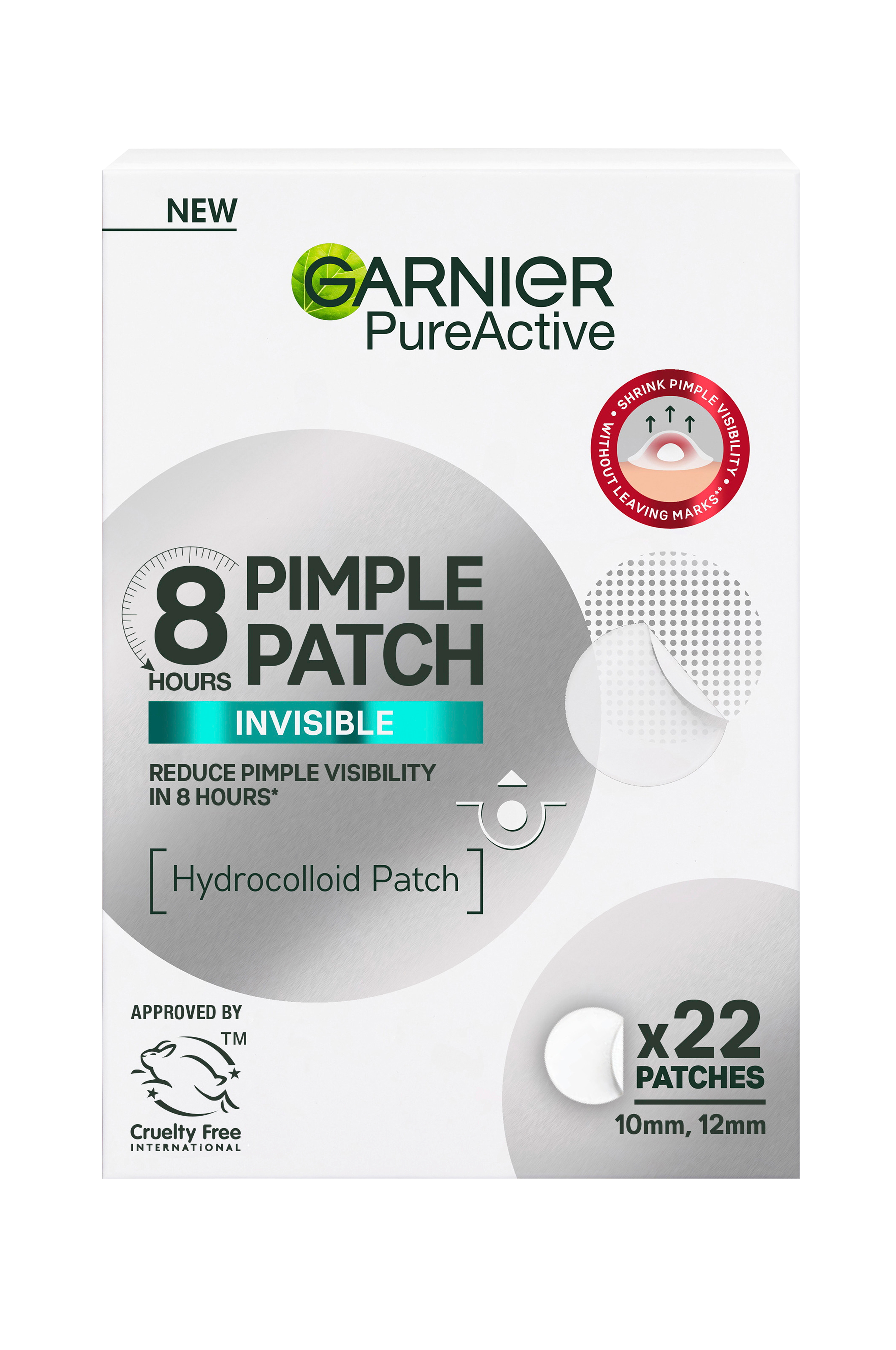 Garnier Pure Active Invisible Pimple Patch är supertunna, självhäftande och absorberande patches som hjälper till att torka ut orenheter och göra dem mindre synbara efter 1 användning*. Kommer i två storlekar, 10 mm och 12 mm. Använding: Ta bort skyddsfilmen från patchen. Sätt direkt på orenheten på ett rent, torrt ansikte. Låt verka i minst 8 timmar och ta sedan bort.