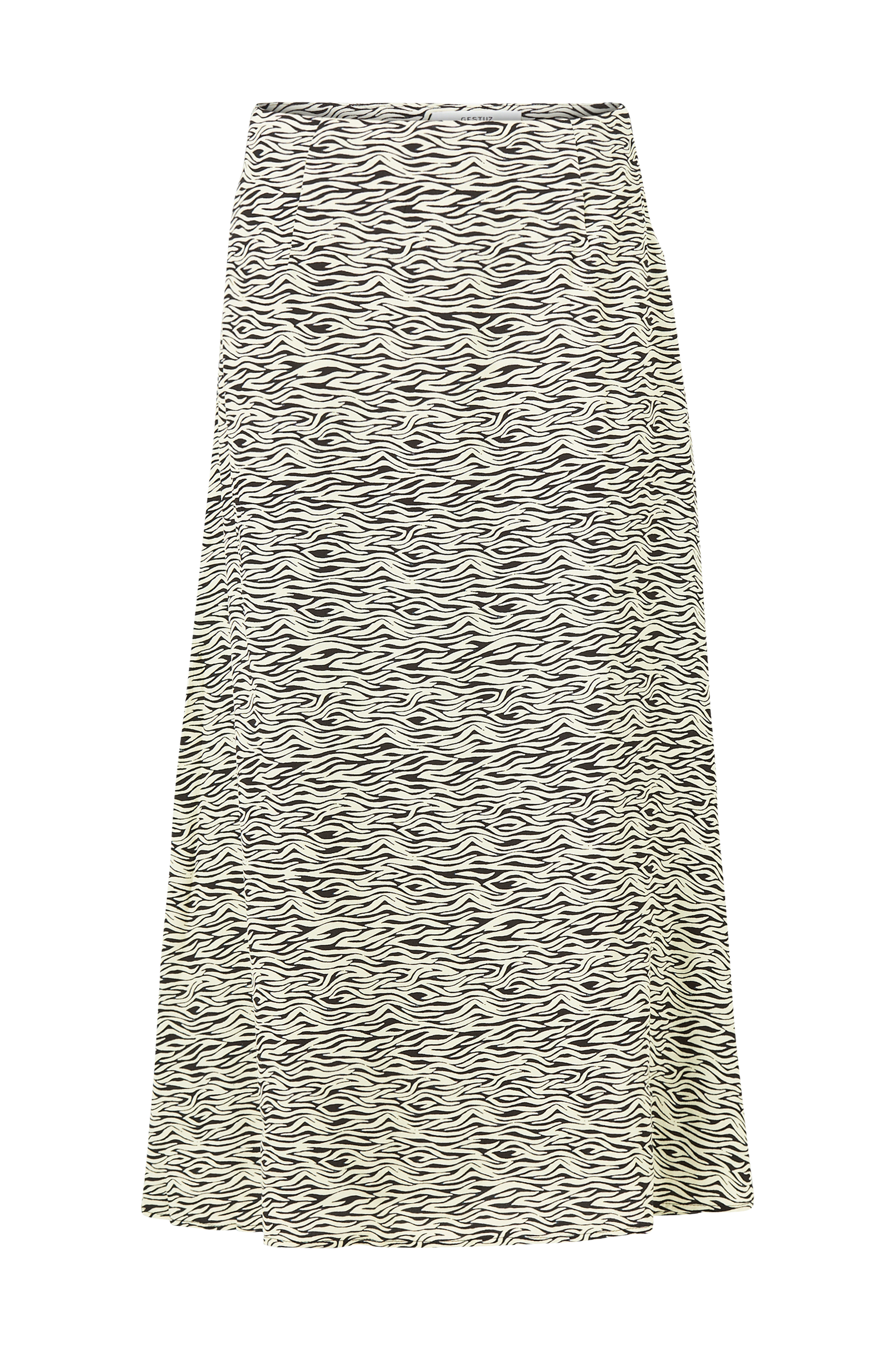 Utsvängd modell i vävd, mönstrad kvalitet med dold dragkedja upptill i ena sidan. Längd ca 85 cm i stl 36.