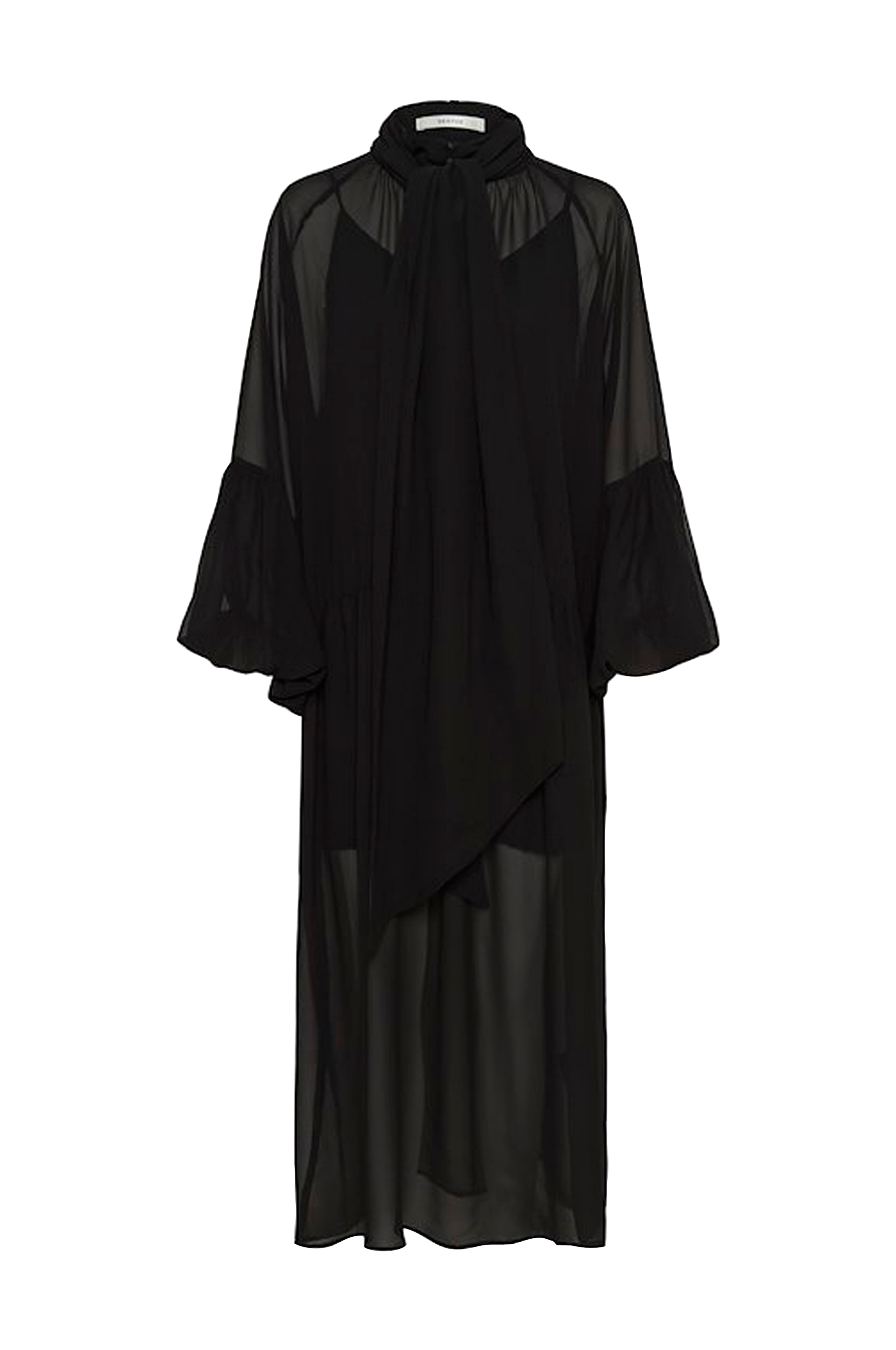 • Transparent klänning i chiffong• Hög hals med knappar och öppning• Vida ballongärmar• Knytskärp• Underklänning i chiffong• Lös passform• Längd: 138 cm i storlek 36