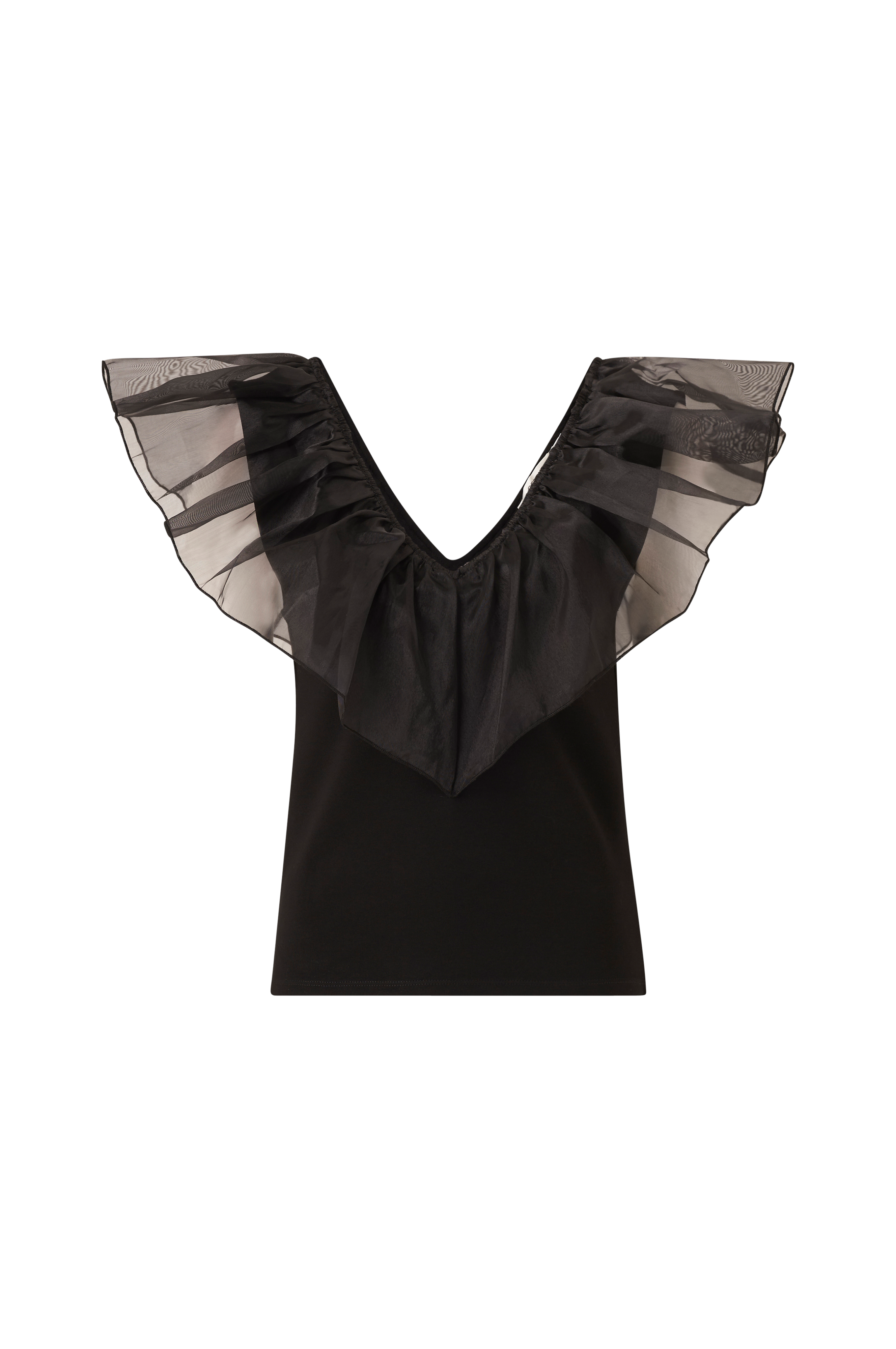 • Figurnära topp i trikå• V-ringning med stor volang i organza fram och bak