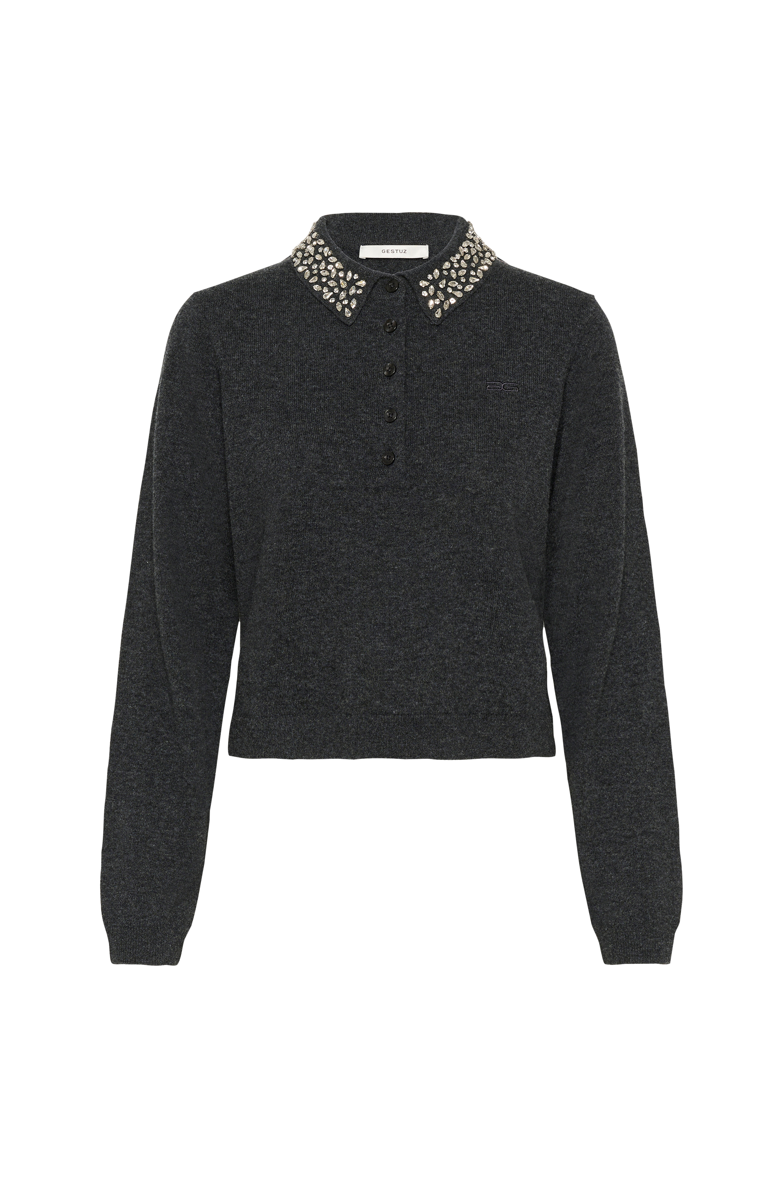 • Mjuk, finstickad tröja i ull• Krage med dekorativa diamanter• Kort knappslå fram• Ribbstickningar i ärmsluten och i nederkanten