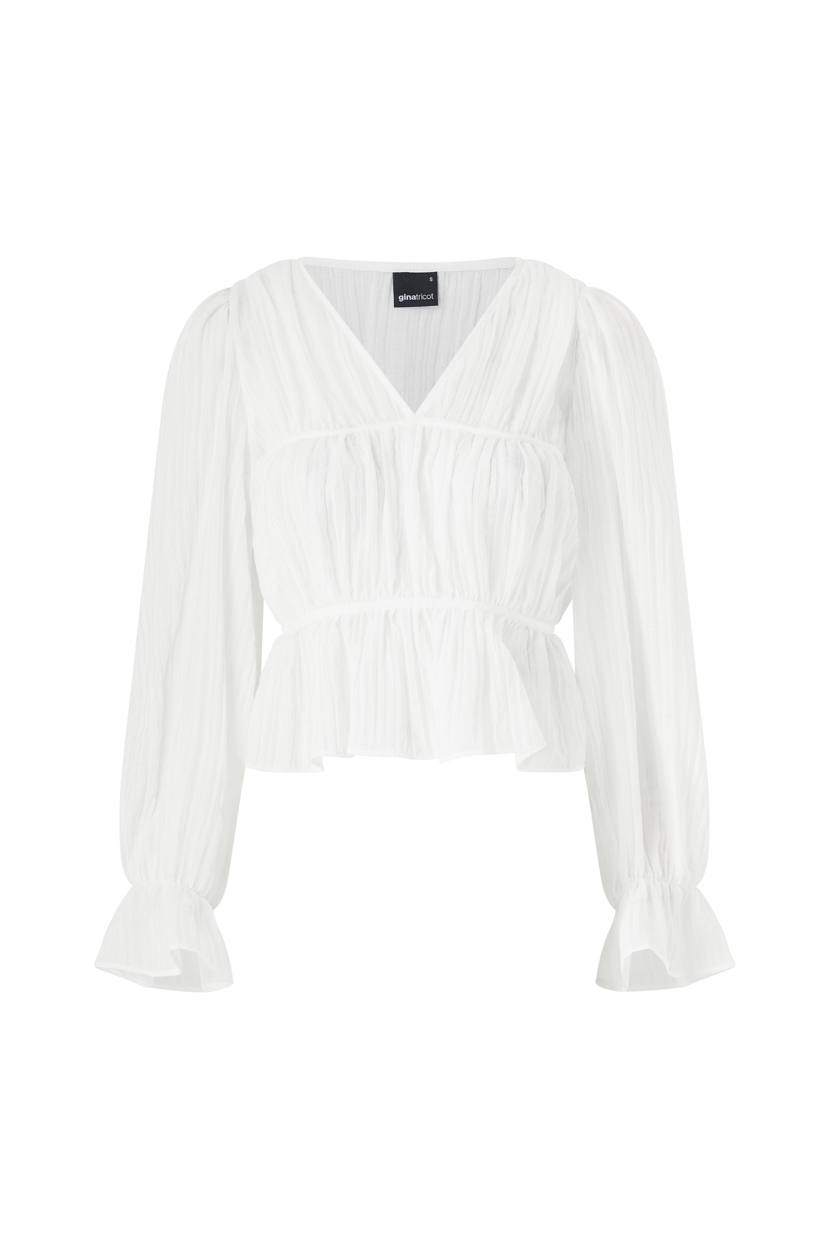 • Blus i tunn viskosmix med en krinklad struktur• V-formad halsringning• Lång ärm med resår och kort volang i ärmsluten• Design med resårsöm• Volangdesign nedtill