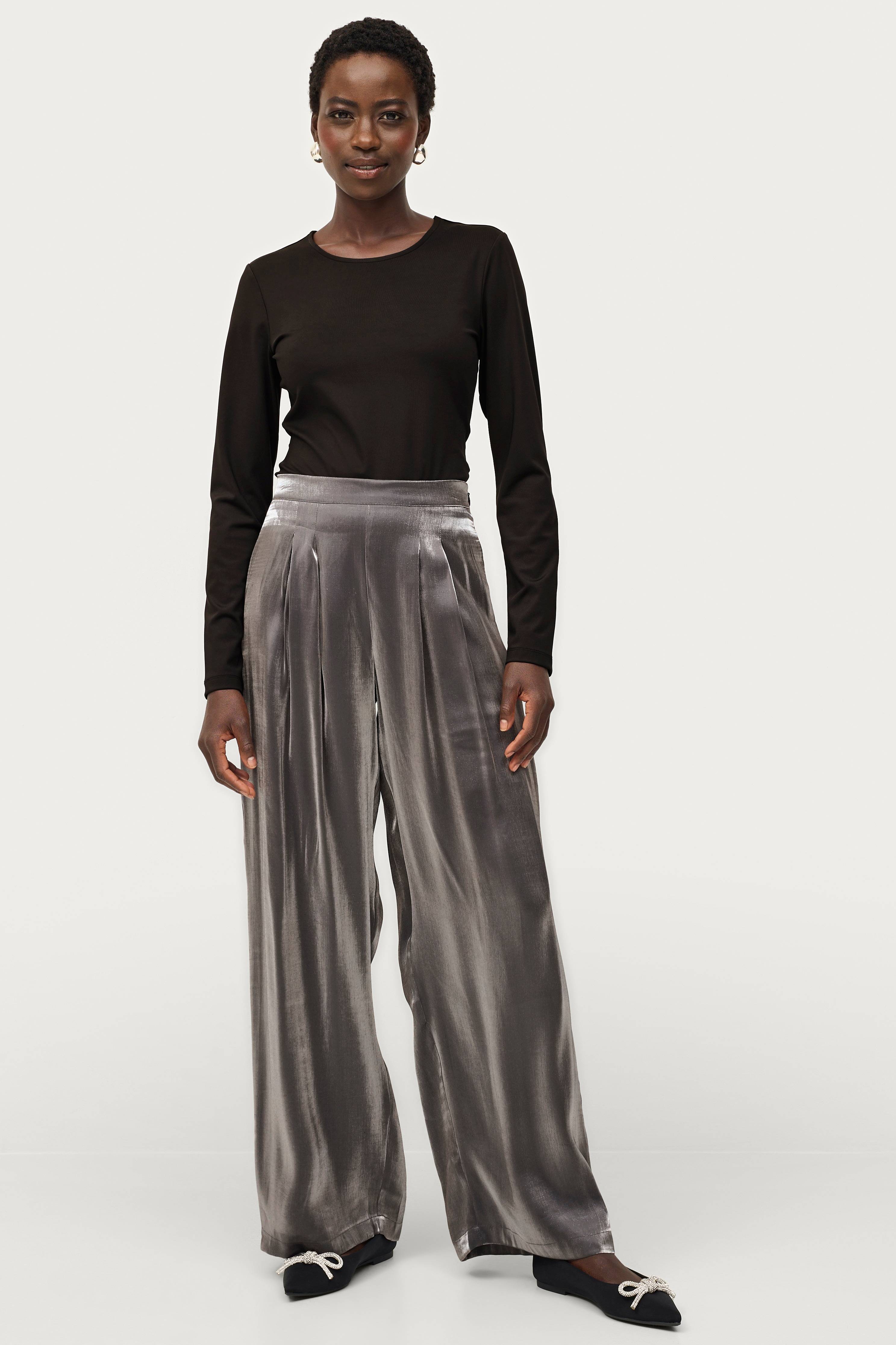 • Vida byxor• Skimrande material• Resår bak i midjan• Veck fram• Fickor i sidorna• Beninnerlängd: 80 cm i storlek S