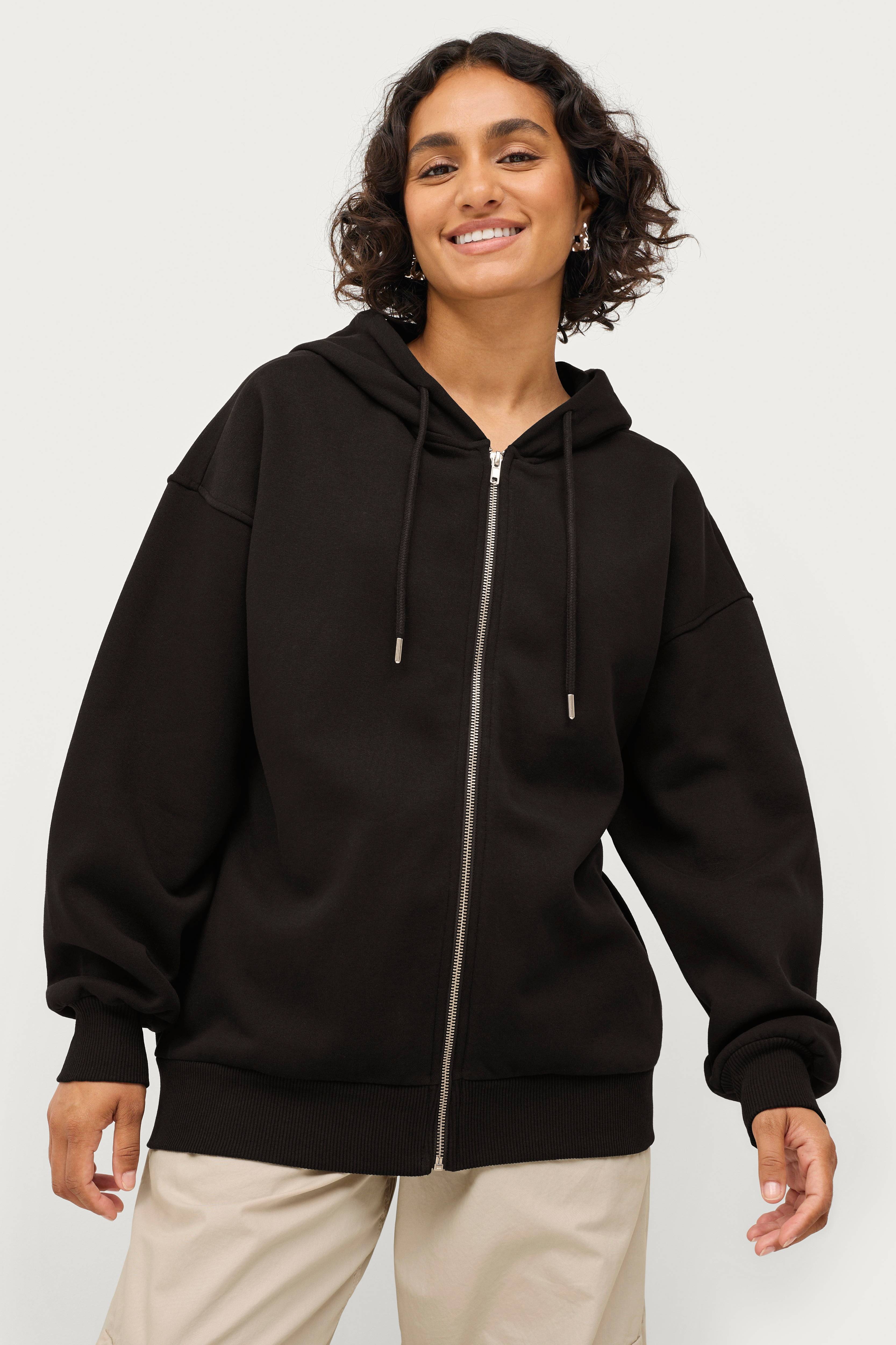 • Oversizemodell• Mjuk, borstad insida• Huva med dragsko• Dragkedja• Ribbmudd i ärmsluten och nedtill