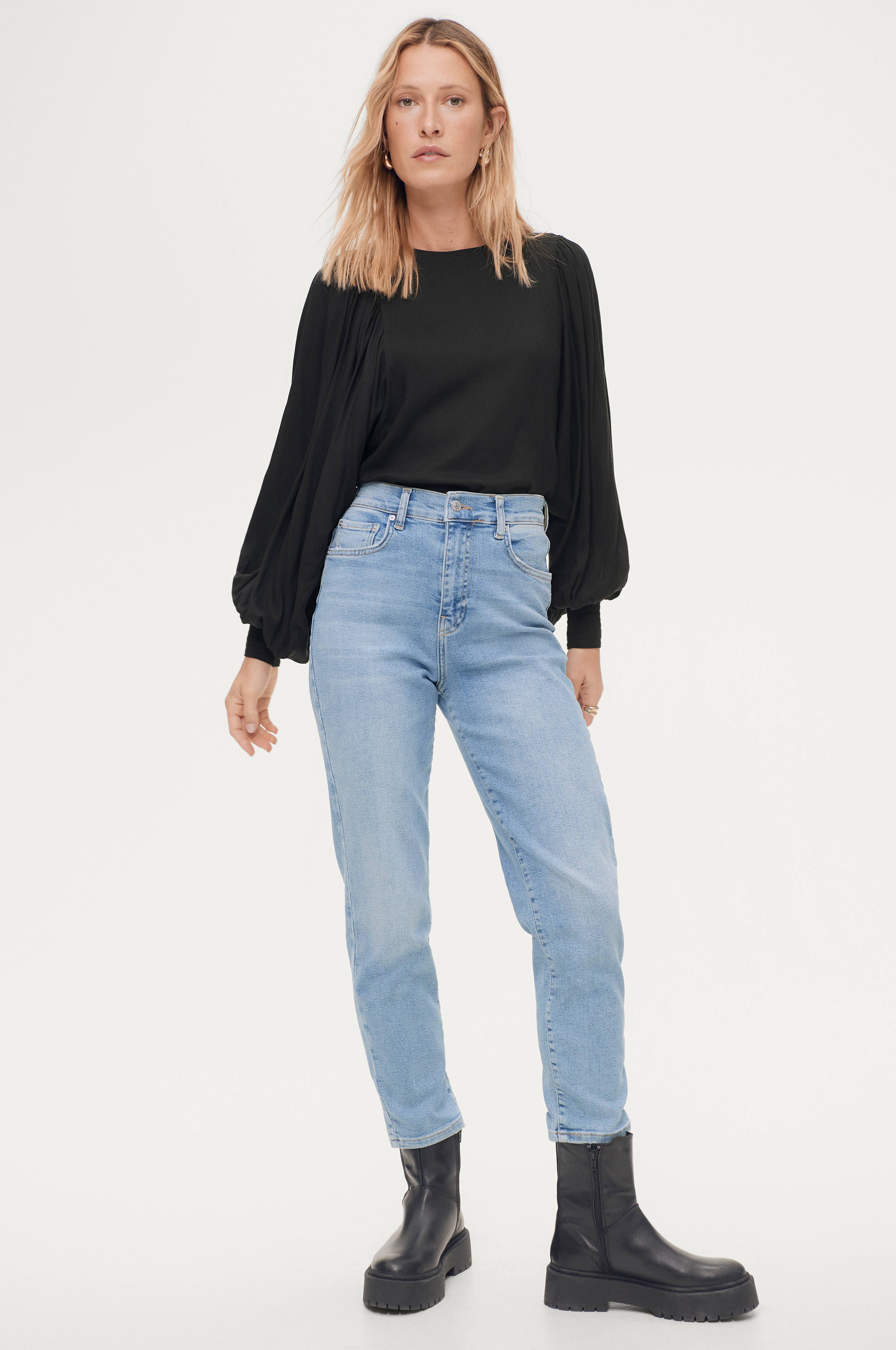 Jeans Comfy Mom från Gina Tricot. Modell med hög midja och vidd i låren samt något avsmalnande benslut. Fem klassiska jeansfickor med små nitar i kanten och dragkedja i gylfen. Beninnerlängd ca 70 cm i stl 36.