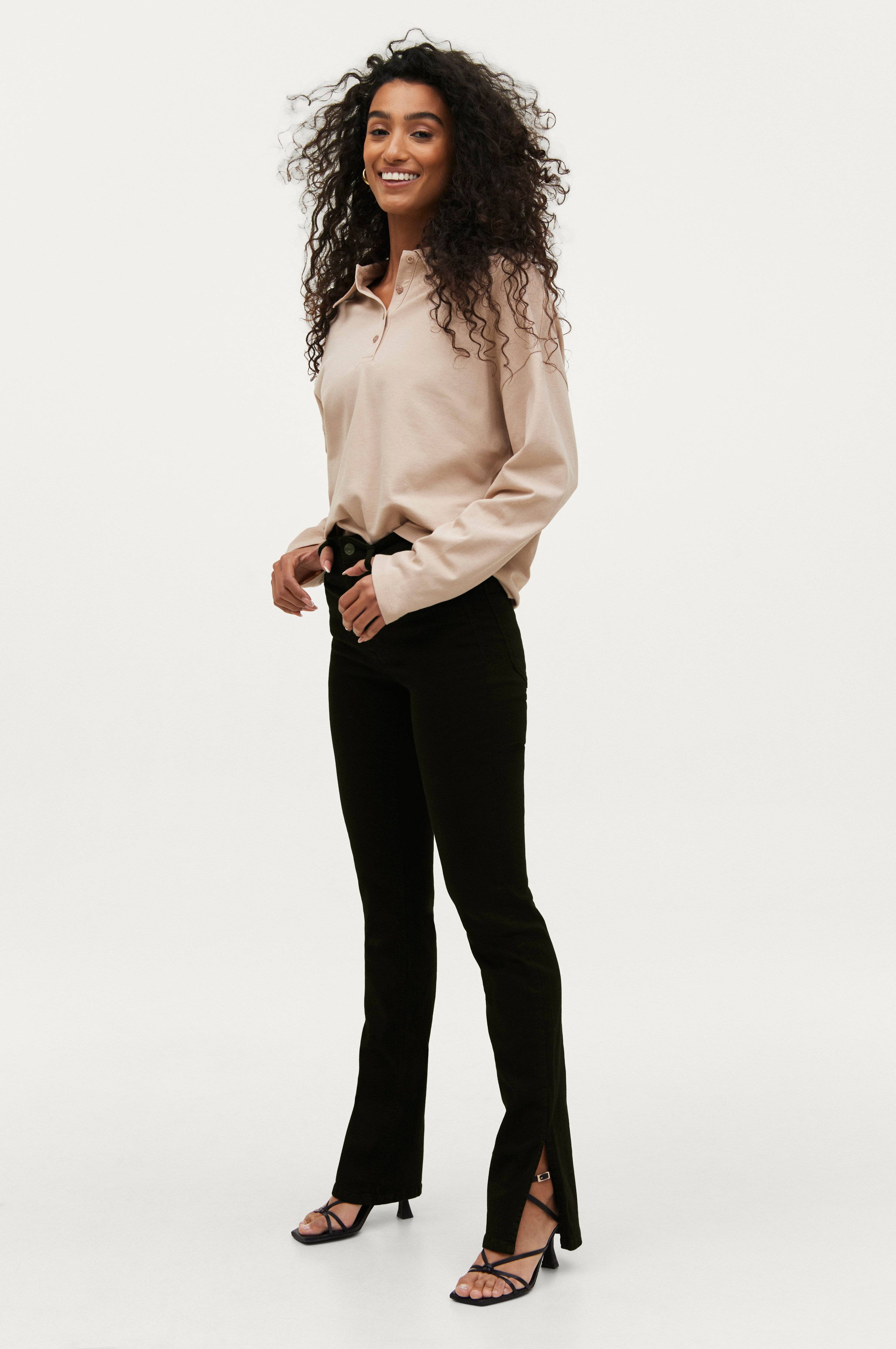 Smala jeans i mjuk stretchkvalitet med slits i bensluten. Femficksmodell med hög midja och dragkedjegylf. Beninnerlängd ca 83 cm.