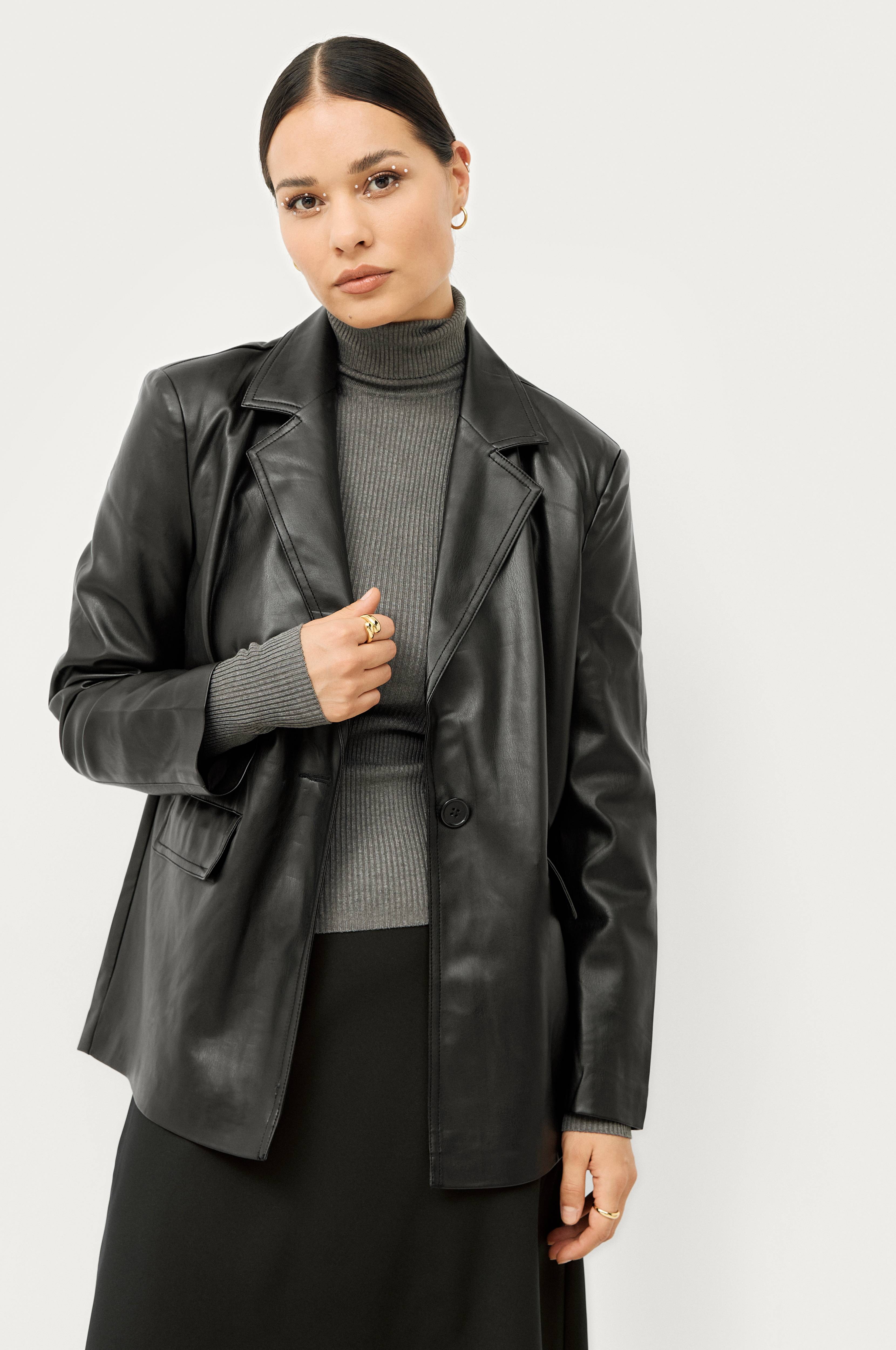 • Rak oversizemodell i skinnimitation• Krage med slag och en knapp fram• Infällda fickor med lock• Sprund nedtill bak• Fodrad• Längd: 69 cm i storlek S