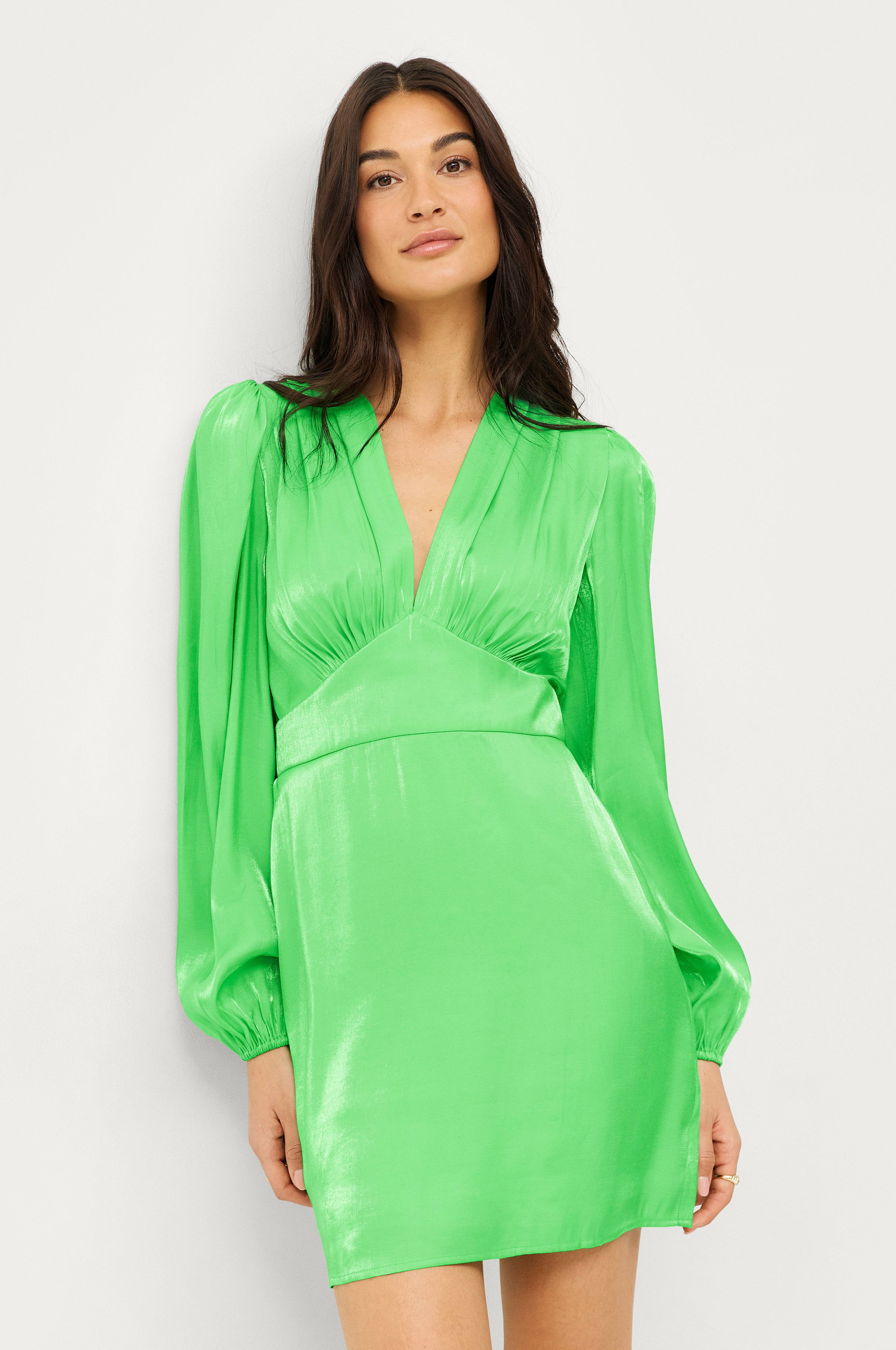 • Djup v-ringning• Rynk vid bysten• Långa ballongärmar med elastiska ärmslut• Veck på axlarna• Dold dragkedja i ryggen• Kvalitet med lyster• Trikåfoder• Längd: 84 cm i storlek S