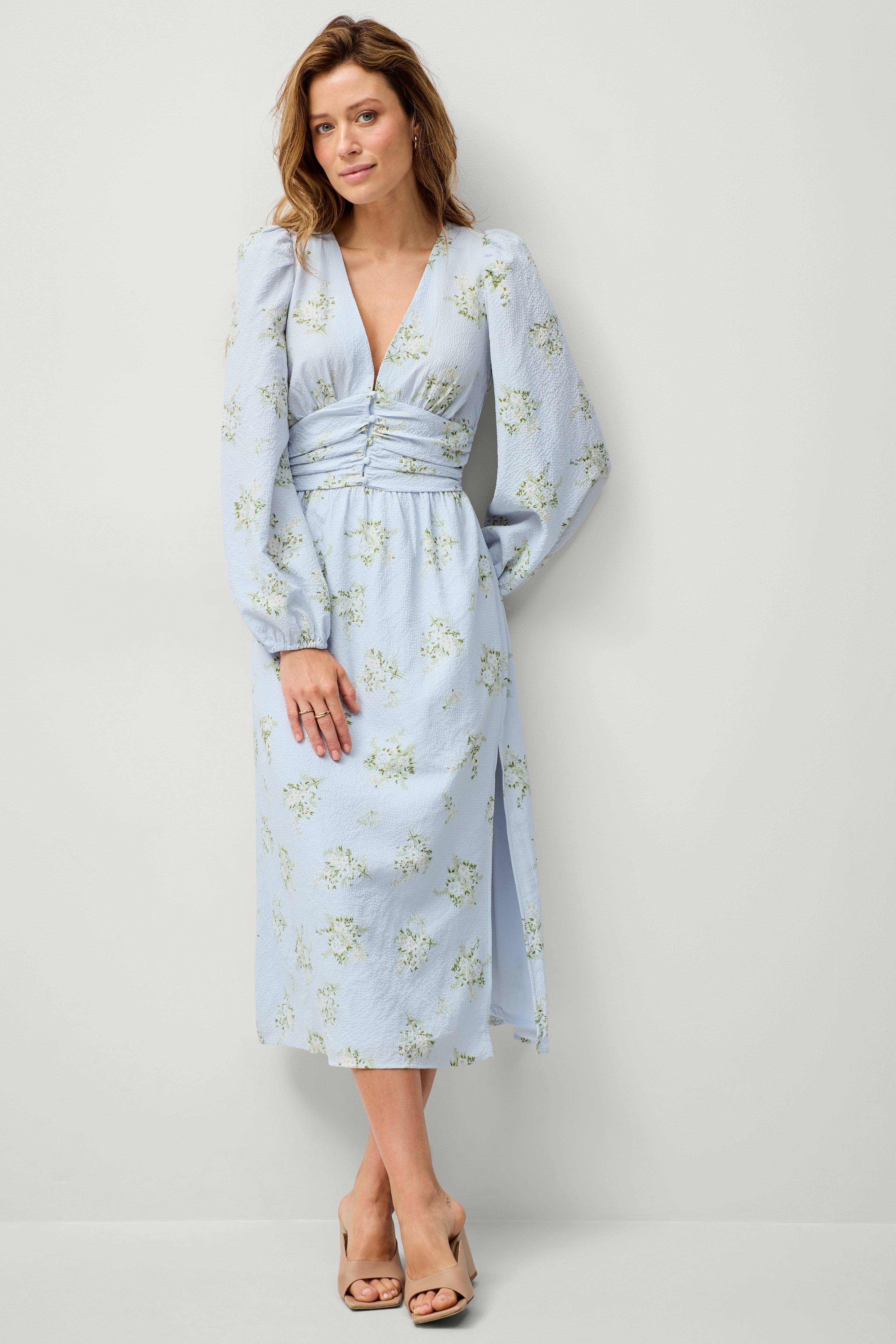• Midiklänning• Strukturerat material• V-ringning• Klädda knappar fram• Resår bak i midjan• Drapering fram• Långa ballongärmar med elastiska ärmslut• Slits i ena sidan• Trikåfoder nedtill• Längd: 125 cm i storlek S