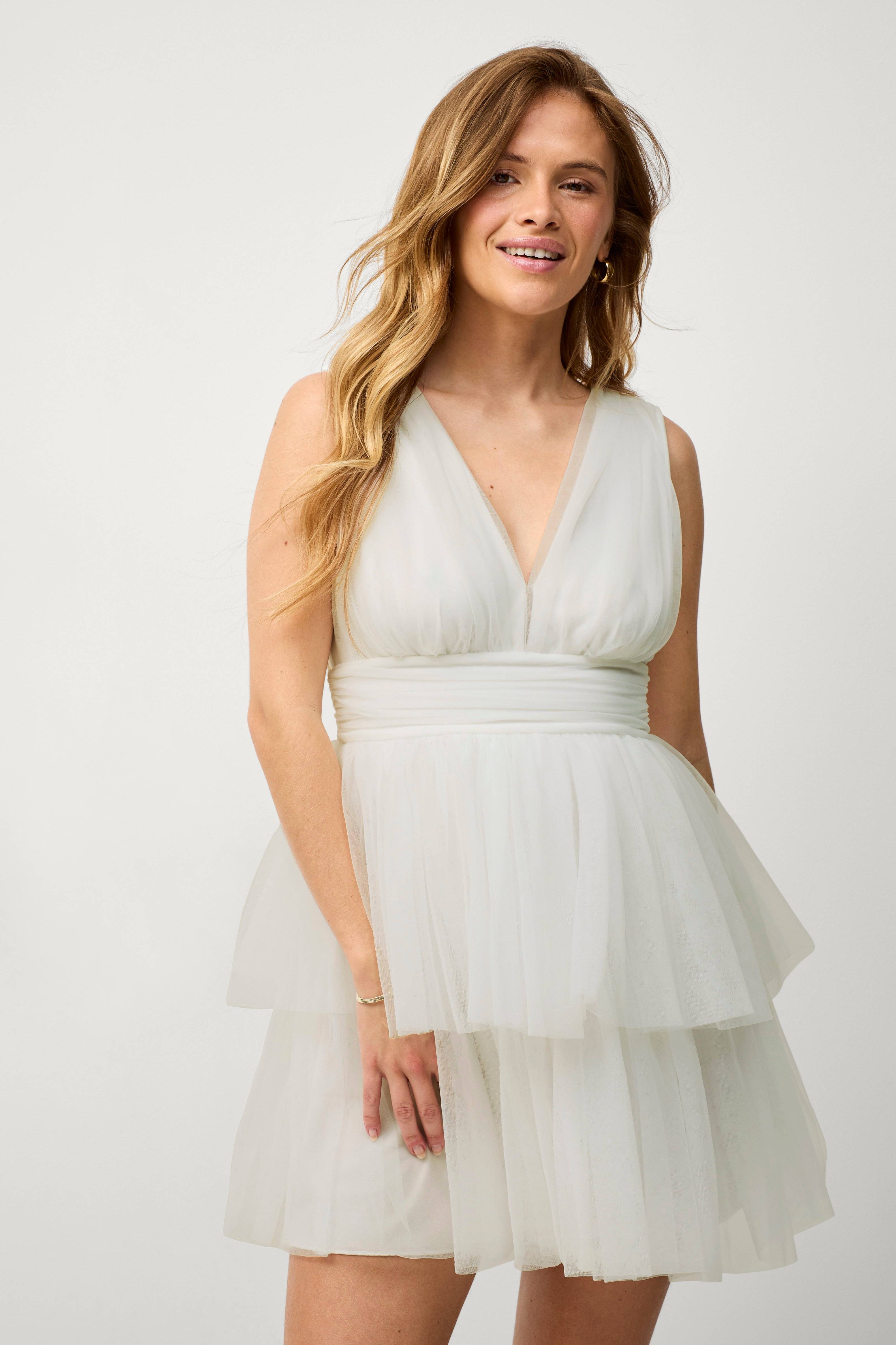 • Kort, figurformad modell i tyll• V-ringning fram och bak med dragkedja i ryggen• Draperad midja• Vid, dubbel kjol• Foder i trikå• Längd: 86 cm i storlek S