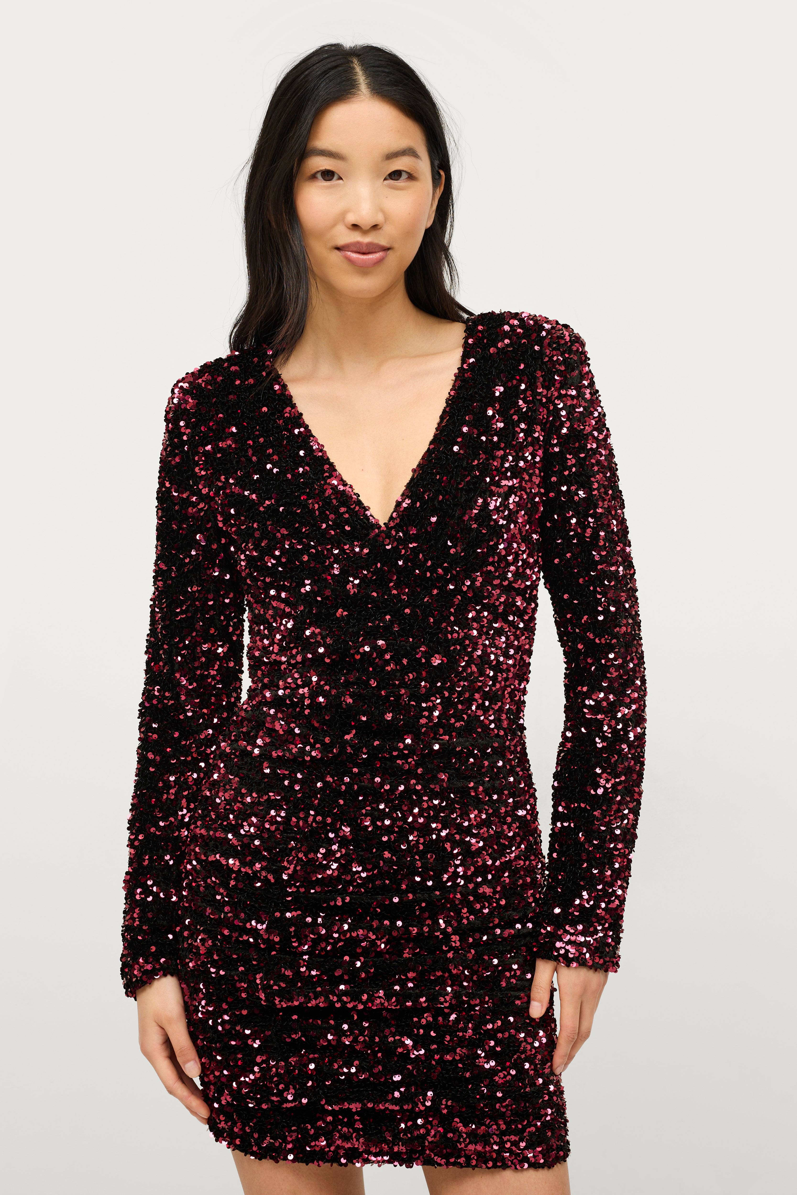 • Figurnära klänning med paljetter• V-ringning• Drapering fram• Dold dragkedja i ryggen• Vävt foder• Axelvaddar• Längd: 86 cm i storlek S