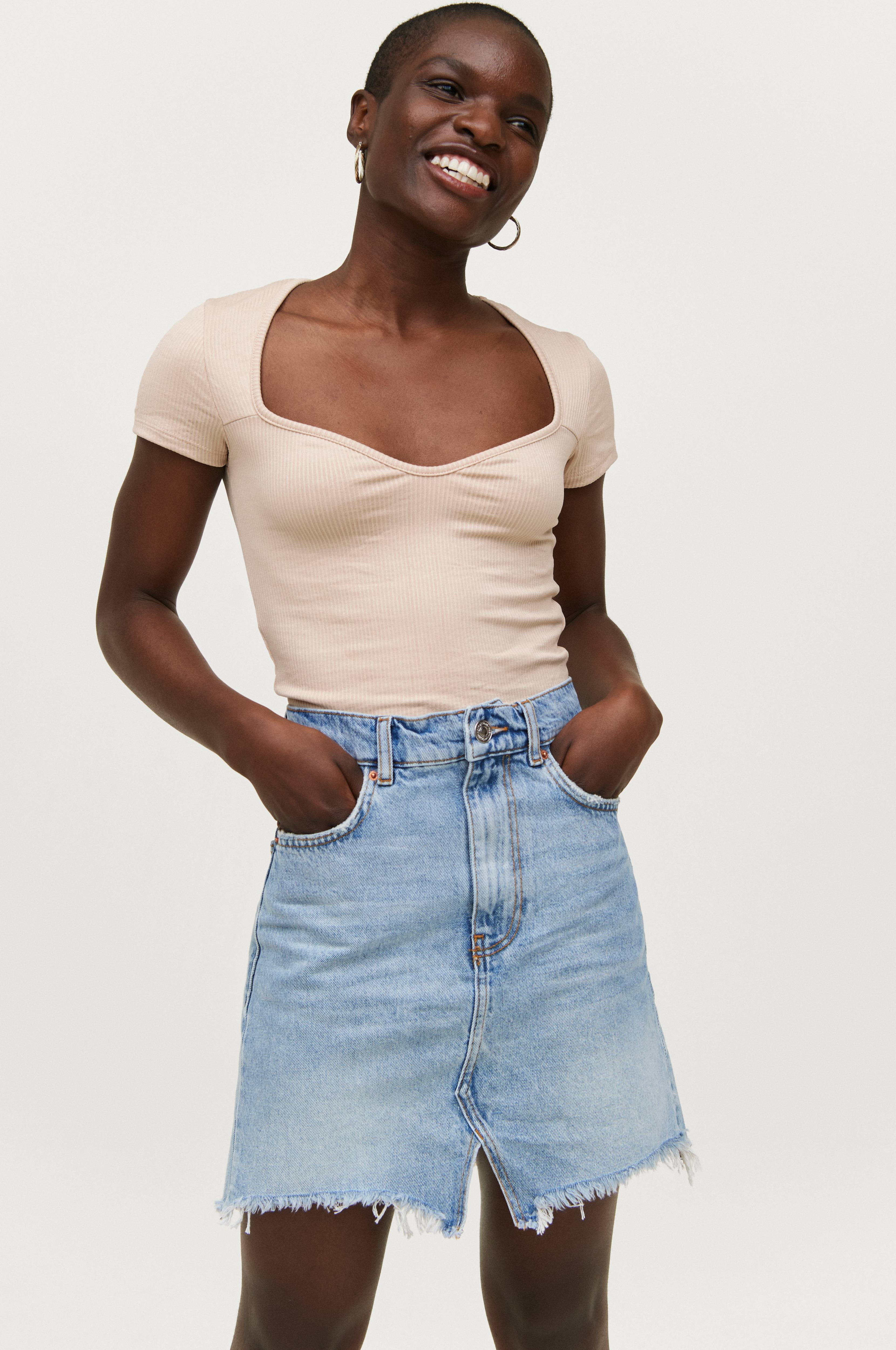 • Kort modell• Dekorativ v-ringning• Kort ärm• Ribbad trikå