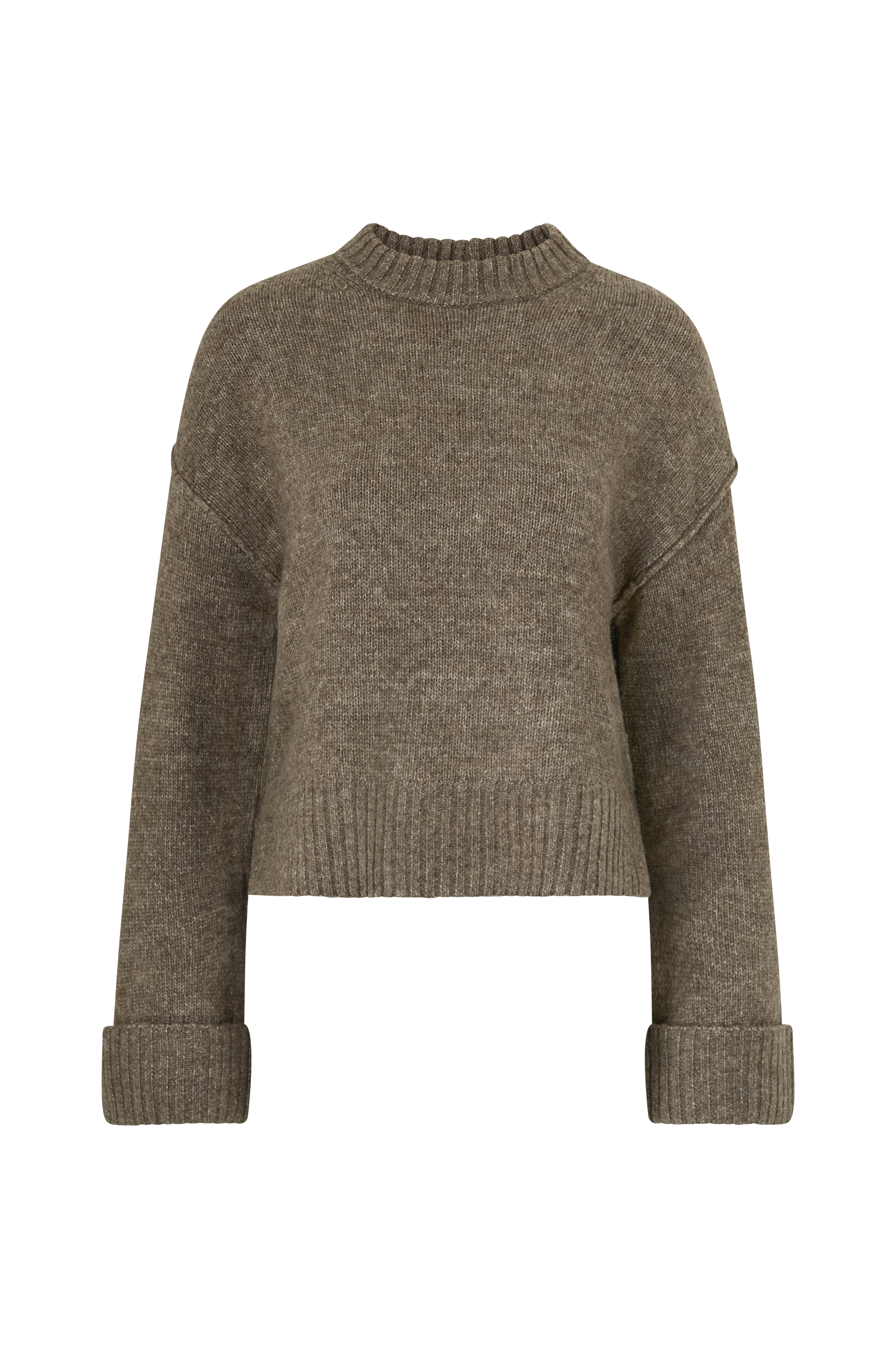 • Stickad tröja med ribbad krage• Långa ärmar med nerhasade axlar och uppvikta, ribbstickade ärmslut• Ribbstickning nedtill med sprund i sidorna