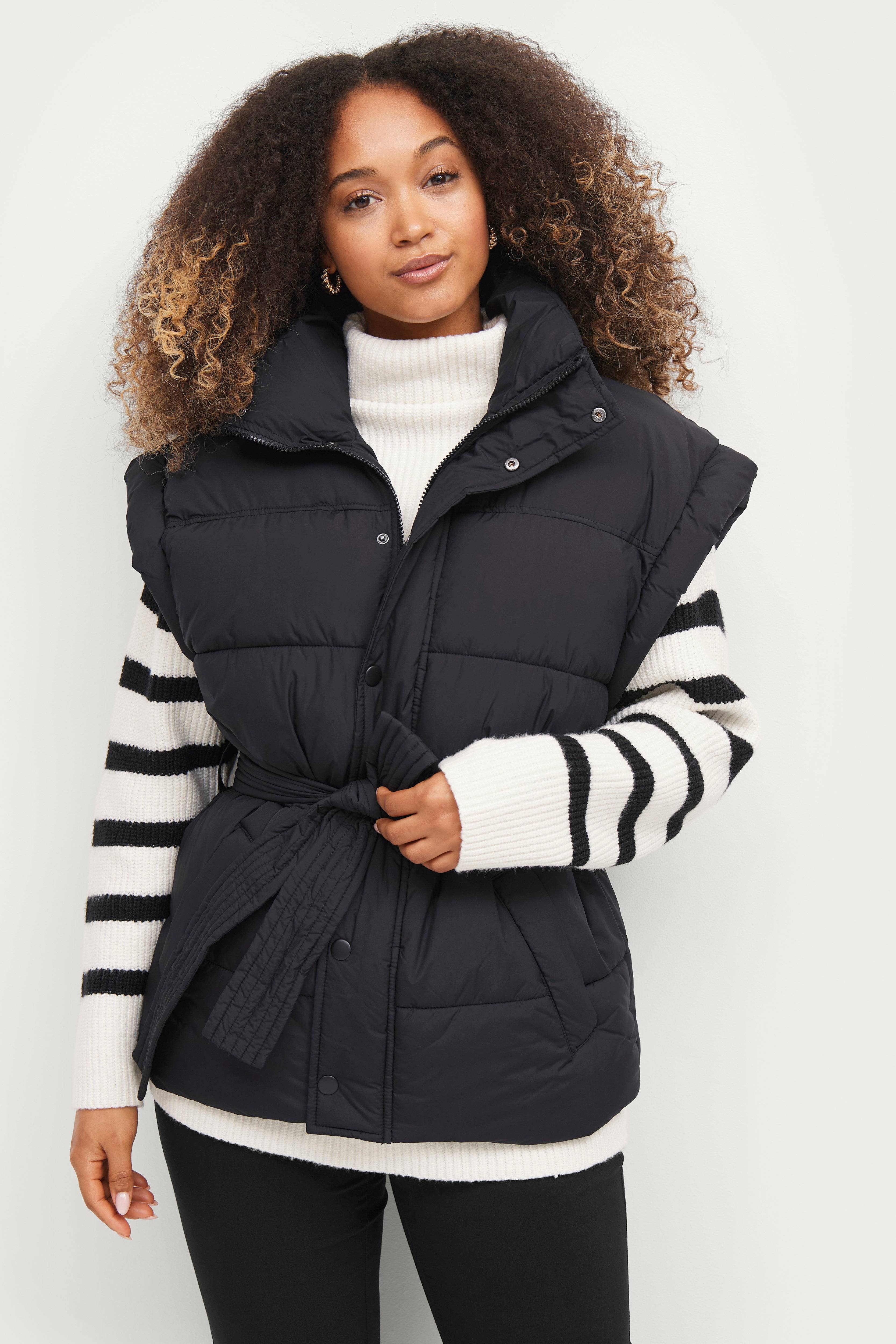 • Quiltad, vadderad väst • Hög krage • Dragkedja • Vindslå med tryckknappar • Avtagbart knytskärp i midjan • Två fickor • Längd: 74 cm i storlek S • Produkten innehåller återvunnet material som har tagits tillvara för att minska mängden avfall, samtidigt som nya resurser inte har förbrukats.