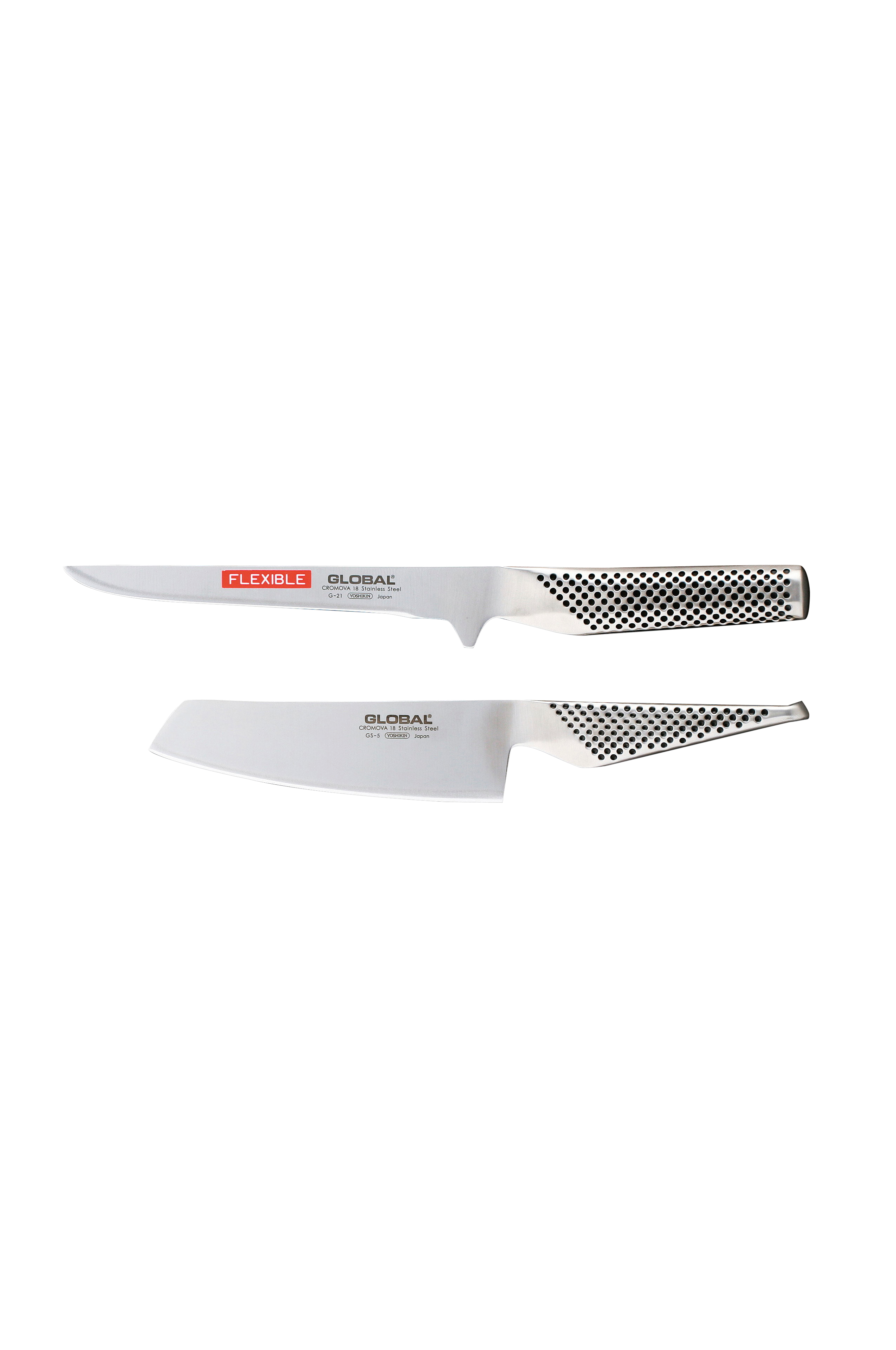 Knivset i två delar från Global. Ett vasst knivset som består av filékniven G-21 och grönsakshackan GS-5. Filékniven har ett flexibelt och relativt smalt blad, vilket underlättar när du filéar fisk. Du kan även använda filékniven till att putsa kött och fågel. Grönsakskniven är det självklara valet när du ska hacka mycket av något. Bladet är nästintill rektangulärt, vilket gör att du kan skära hela vägen genom råvaran utan att skjuta eller dra kniven.