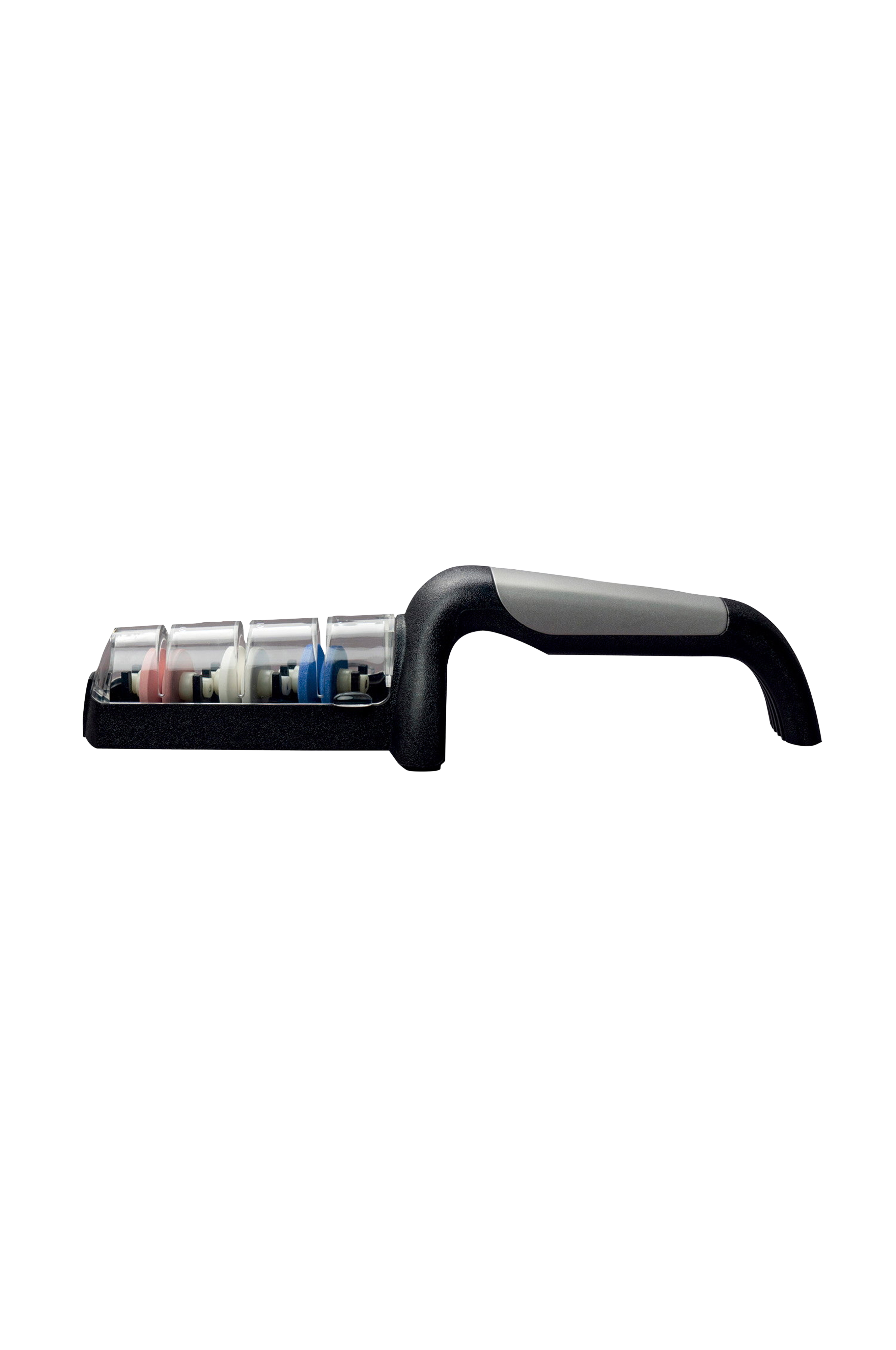 Knivslip från Global. Håll efter dina köksknivar genom att då och då skärpa dem med Globals våtslip. Allt du behöver göra är att fylla knivslipen med lite vatten och dra några drag med kniven genom de olika hjulen, så blir skärpan som ny. Våtslipen har sliphjul i tre olika grovlekar: grov (120 i kornstorlek), medelgrov (240 i kornstorlek) och fin (600 i kornstorlek). Hjulen fyller olika funktioner. Det grova hjulet används för att slipa fram en ny, vass egg på slöa knivar. För underhållning av skärpan används det medelgrova, följt av det fina sliphjulet.