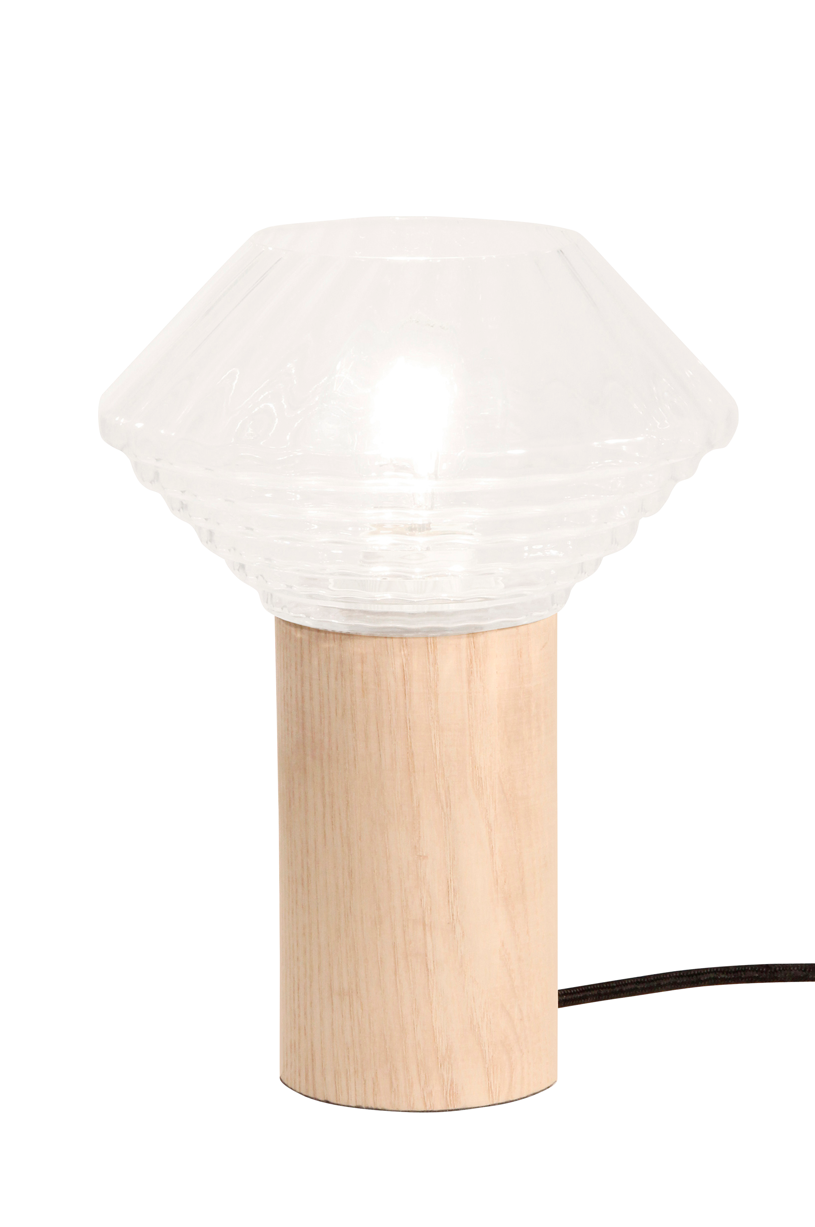 Bordslampa med fot av naturligt ljust trä och profilerat glas som ger vackra skuggor. Textilkabel med brytare. Höjd 30 cm och diameter 20 cm. Lamphållare E27 Max 60W. Rekommenderad glödlampa: E140 Halolux normal klar. Ljuskälla ingår ej.
