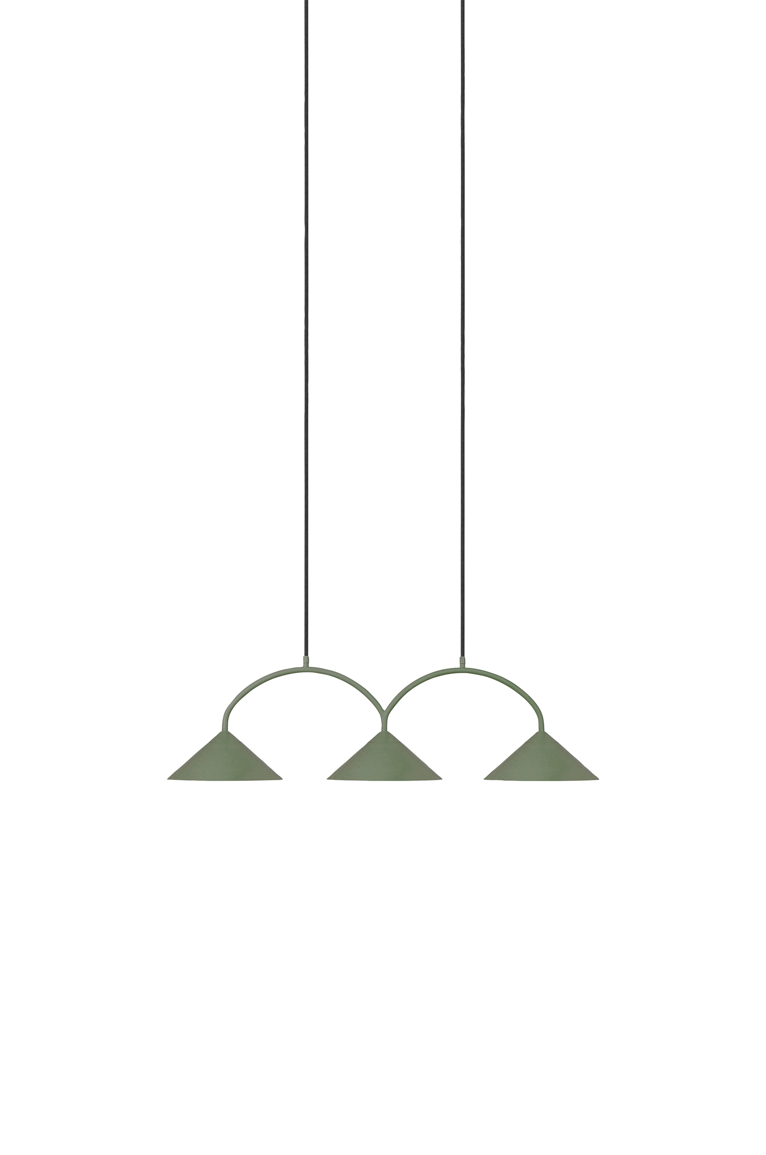 Curve 3 är resultatet av en lek med geometriska former där de mjuka rundade bågarna möter skärmarnas skarpa triangulära linjer. Denna lampa är perfekt att hänga över matsalsbordet såväl som över köksön. Lampan är tillverkad av mattlackerad metall med tre stycken metallskärmar, två stycken 200 cm långa svarta textilkablar och en matchande takkopp i metall. Lampans plugg för takanslutning säljs separat.