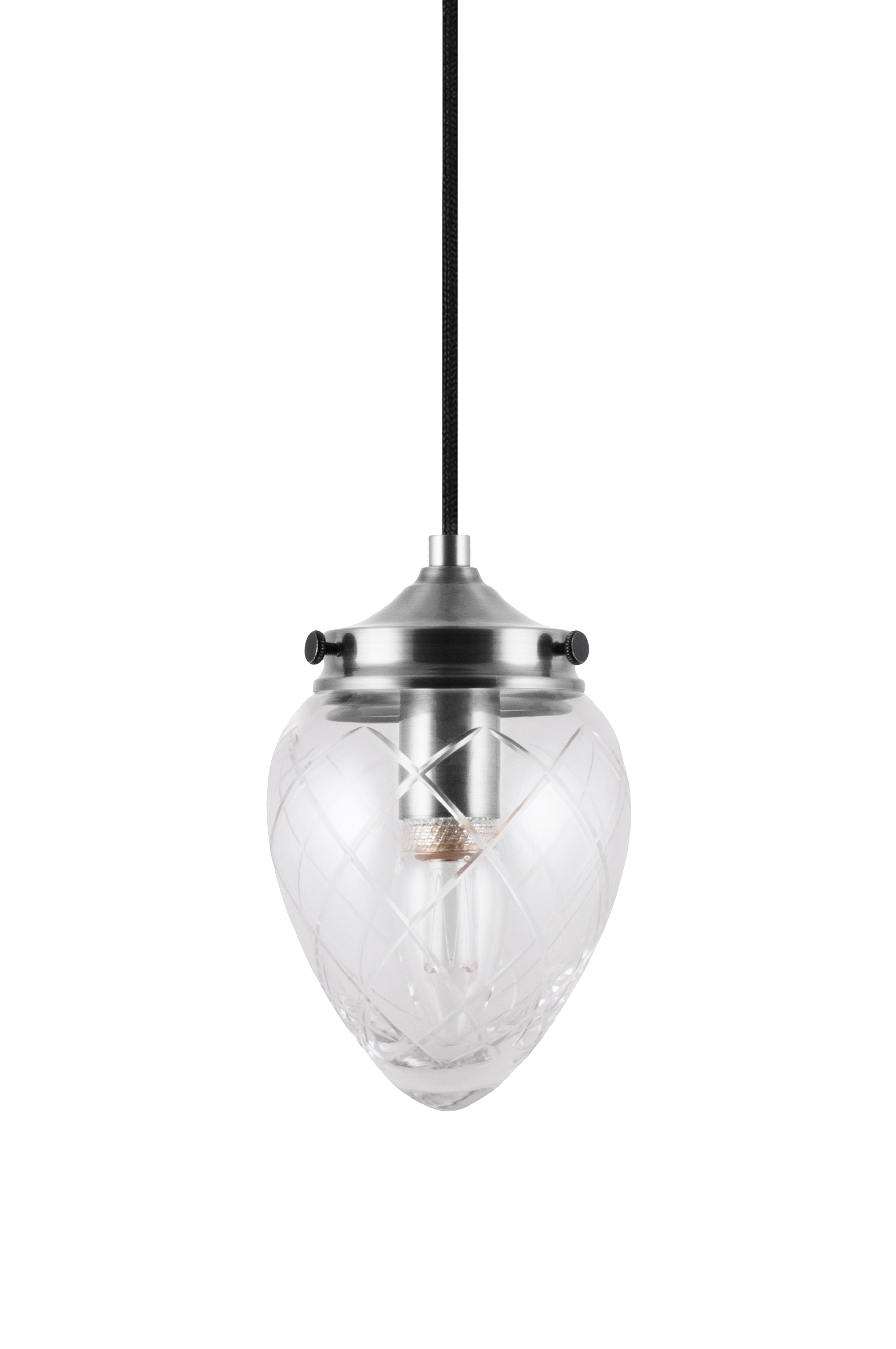 Juni är en pendel som andas elegans med sin slipade glasskärm och antika stål, en hyllning till det tidiga 1900-talets design. Lampan har en 350 cm svart textilkabel med strömbrytare och europakontakt.