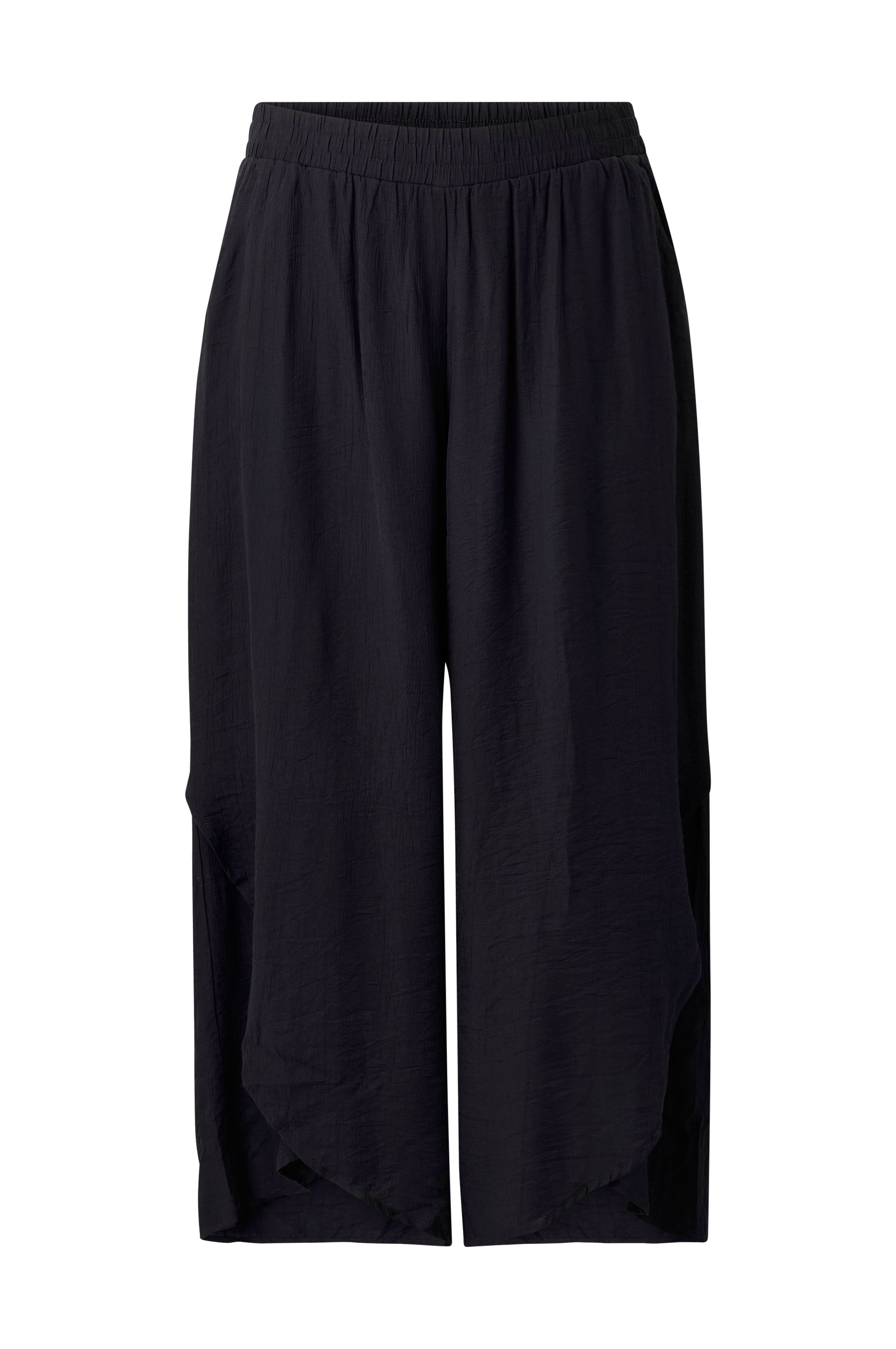 • Byxor med lätt krinklat material• Lös passform• Resår i midjan• Sidfickor• Asymmetriska benslut med slits i sidorna• Plusstorlekar• Beninnerlängd: 62 cm i storlek S