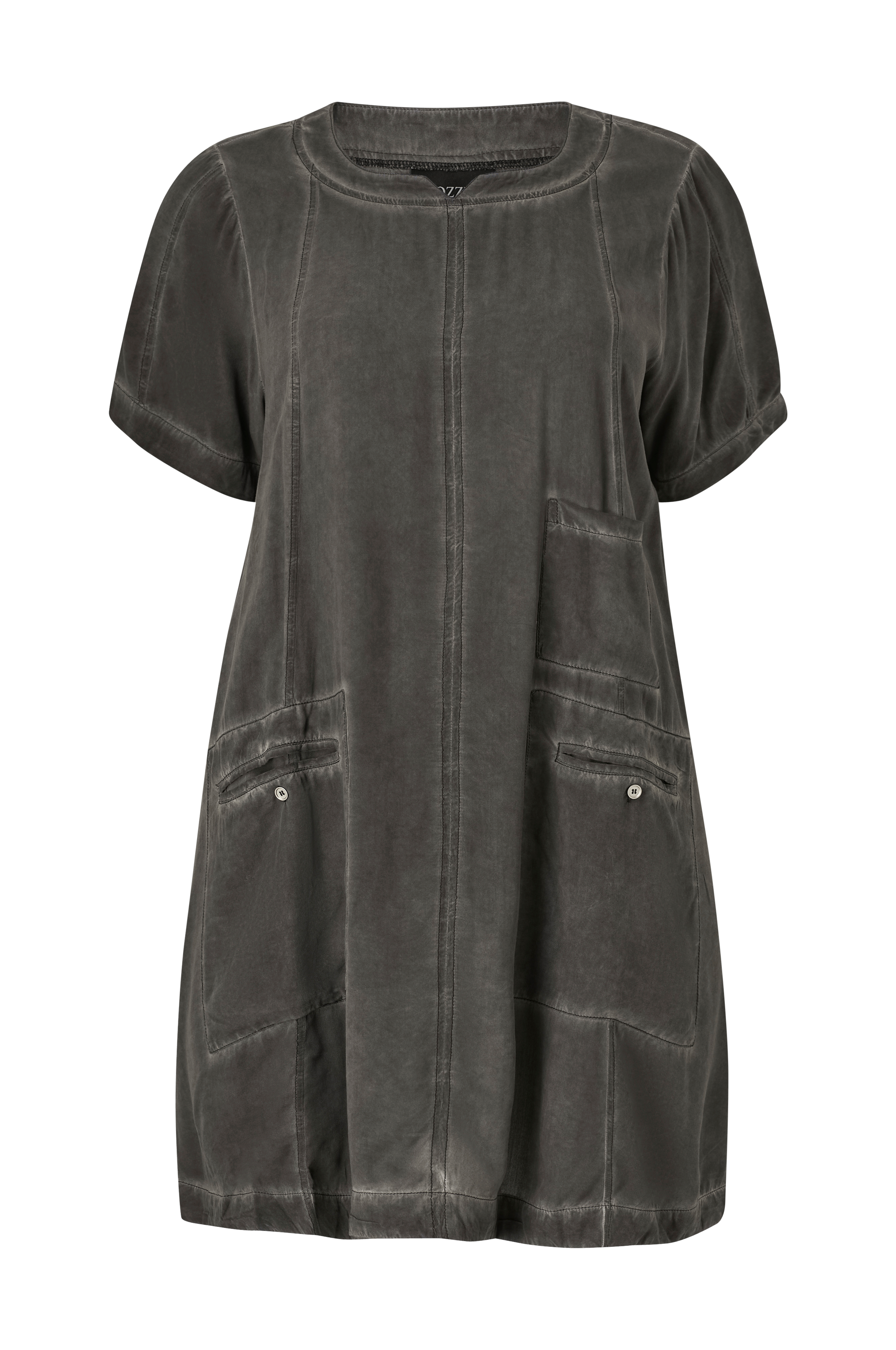 • Plusstorlekar• Utsvängd modell i mjuk viskos• Rund hals• Kort ärm• Påsydda fickor• Längsgående, dekorstickade sömmar fram och bak• Längd: 94 cm i storlek 42/44