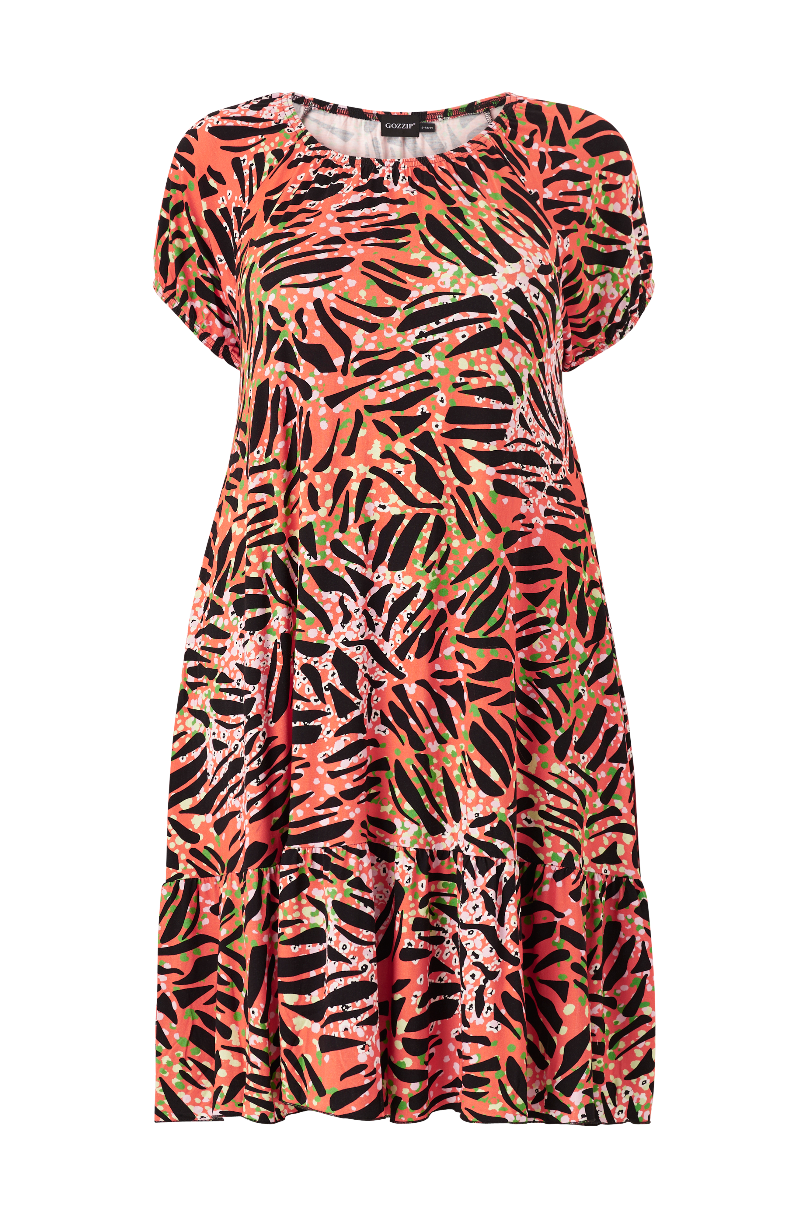 • Klänning i viskostrikå• A-linjeform• Elastisk halsringning• Korta ärmar• Volang nedtill• Plusstorlekar• Längd: 104 cm i storlek S