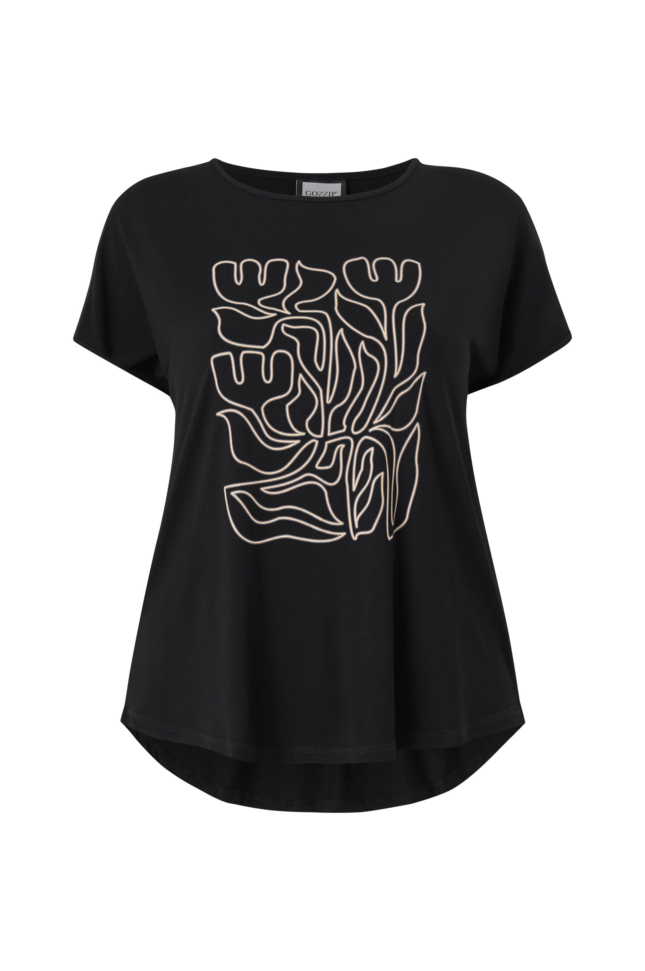 • Mjuk t-shirt i viskosmix• Rund halsringning• Holkärmar• Dekorativt tryck fram• Rundad nederkant• Plusstorlekar
