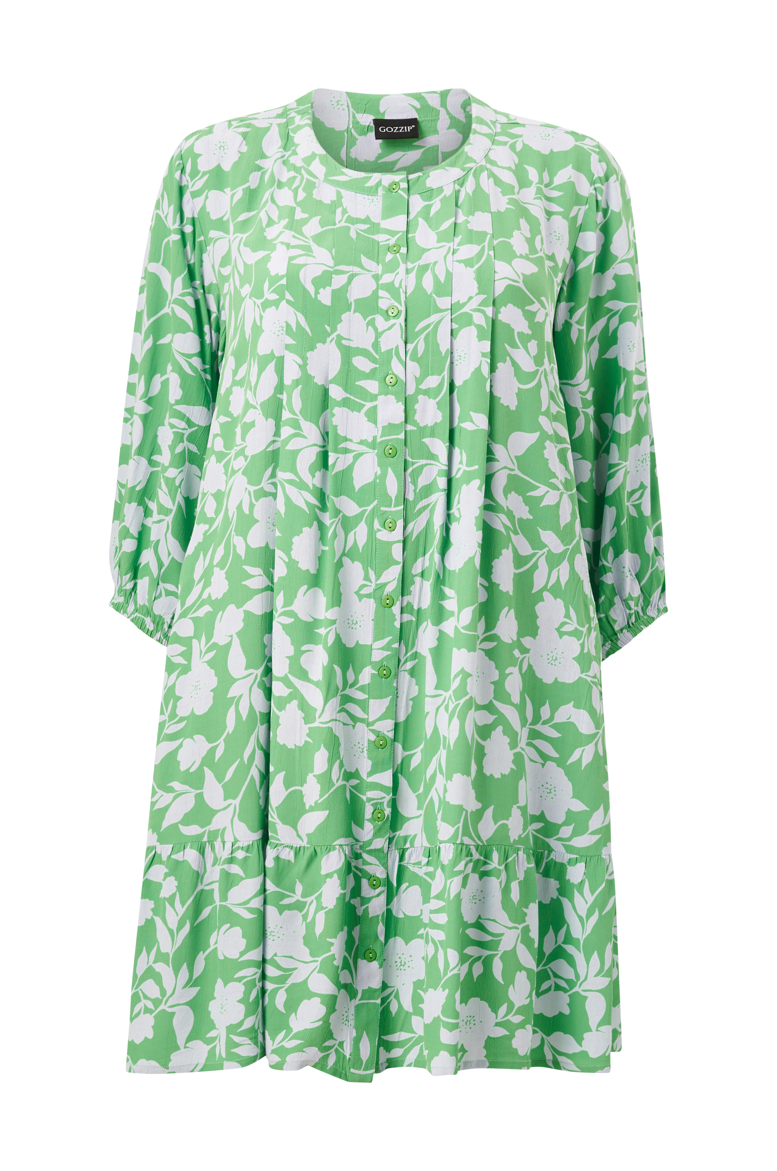 Tunika med lös, vid passform. Knappar fram och volang nedtill. 3/4-långa ballongärmar. Längd ca 101 cm i stl S.