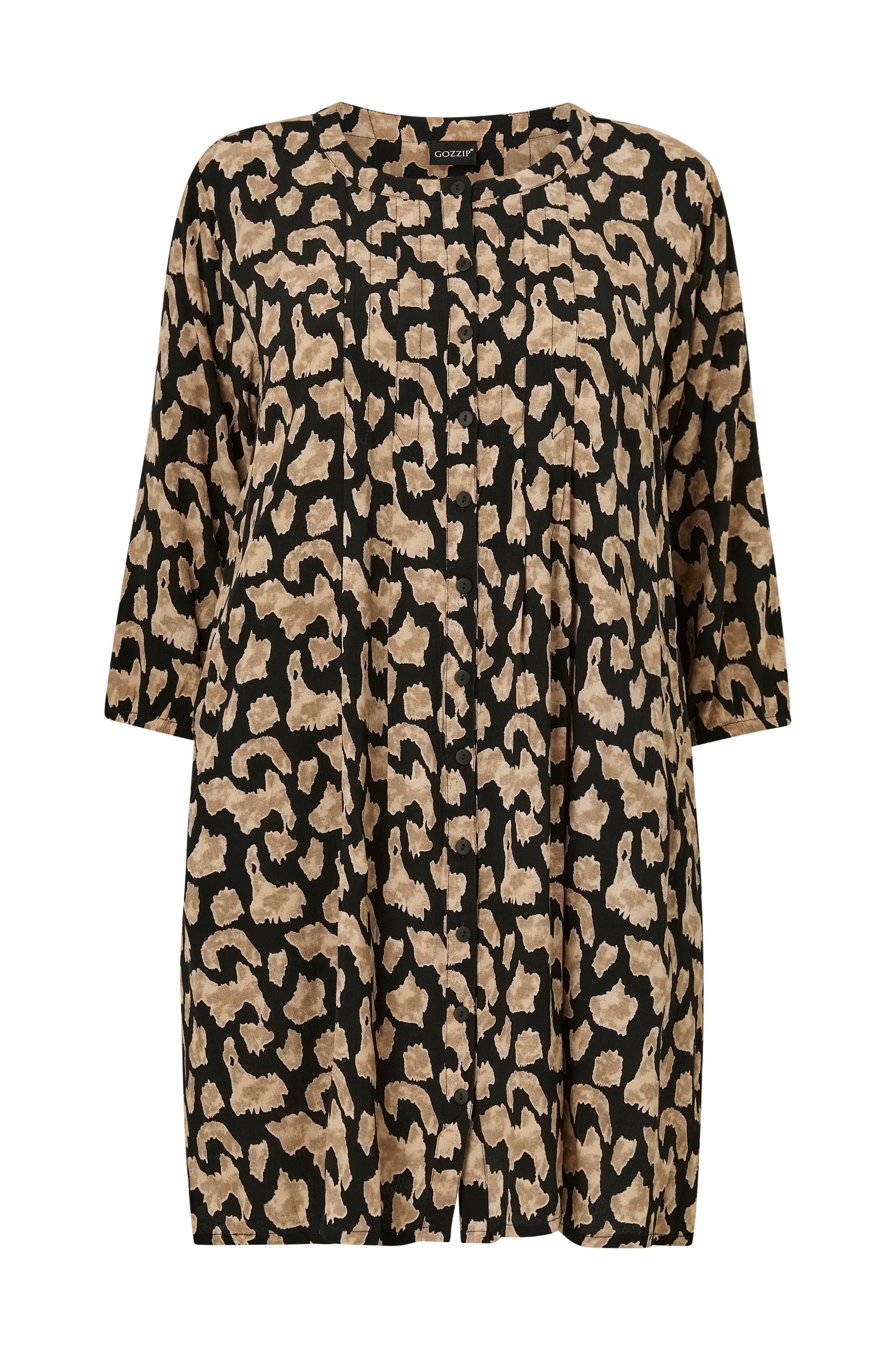 • Mönstrad tunika i viskos• Knappar fram• Fickor i sidorna• 3/4-långa ärmar med elastiska ärmslut• Sydda veck upptill fram• Plusstorlekar• Längd: 100 cm i storlek S