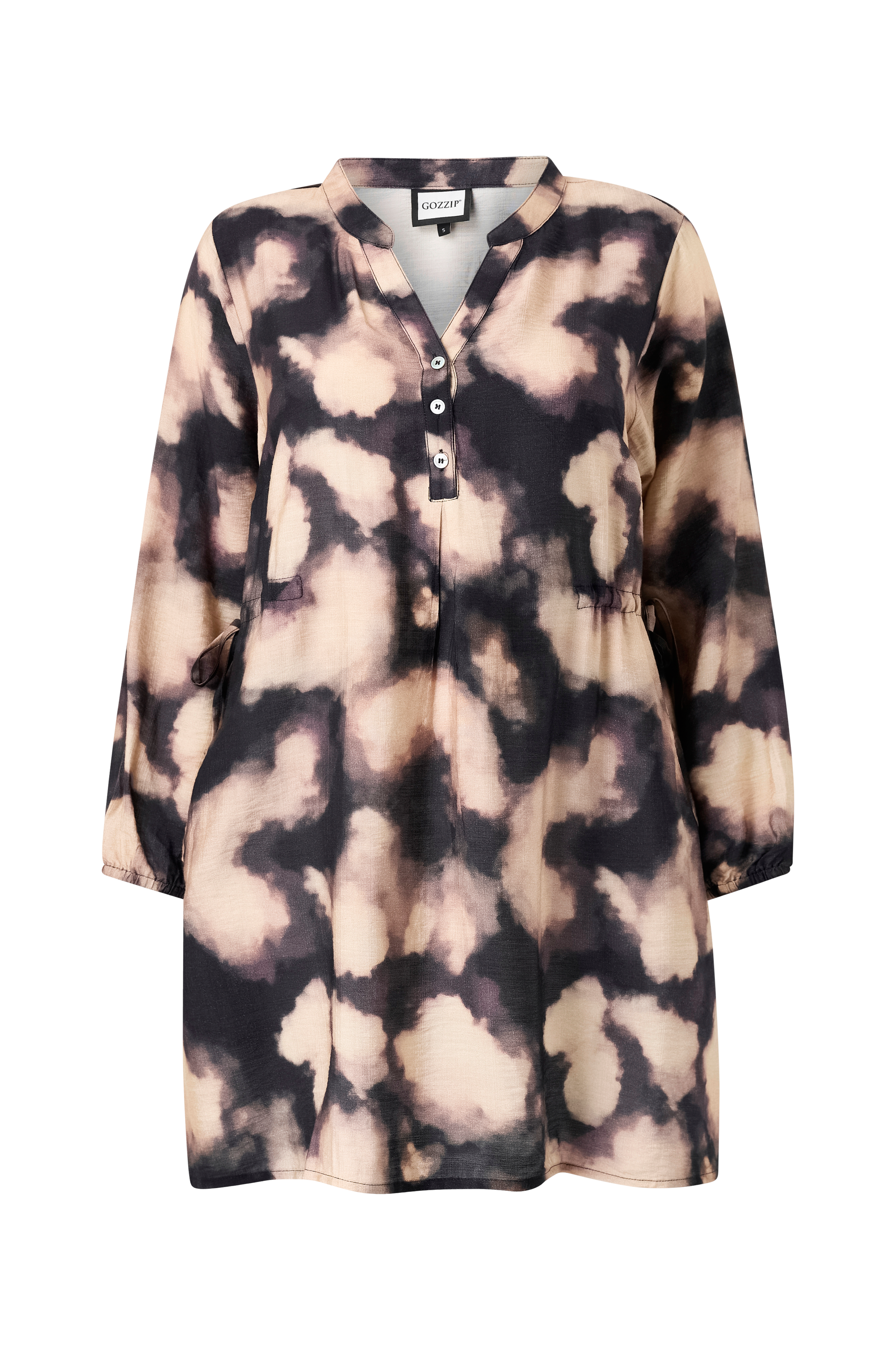 • Mönstrad tunika i viskosmix• V-ringning• Långa ärmar• Resår i ärmsluten• Kort knappslå• Dragsko i midjan• Sidfickor• Plusstorlekar• Längd: 90 cm i storlek S